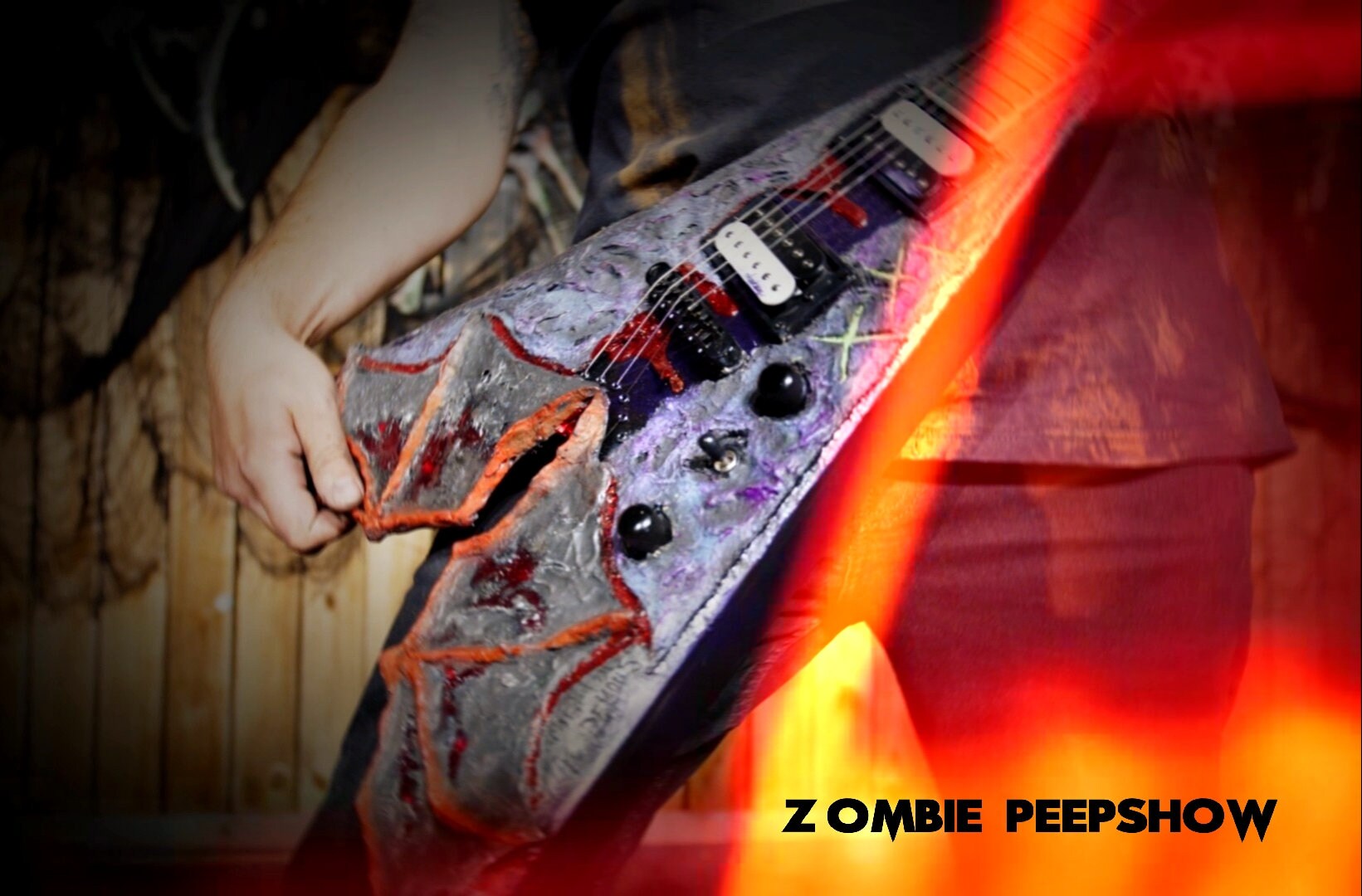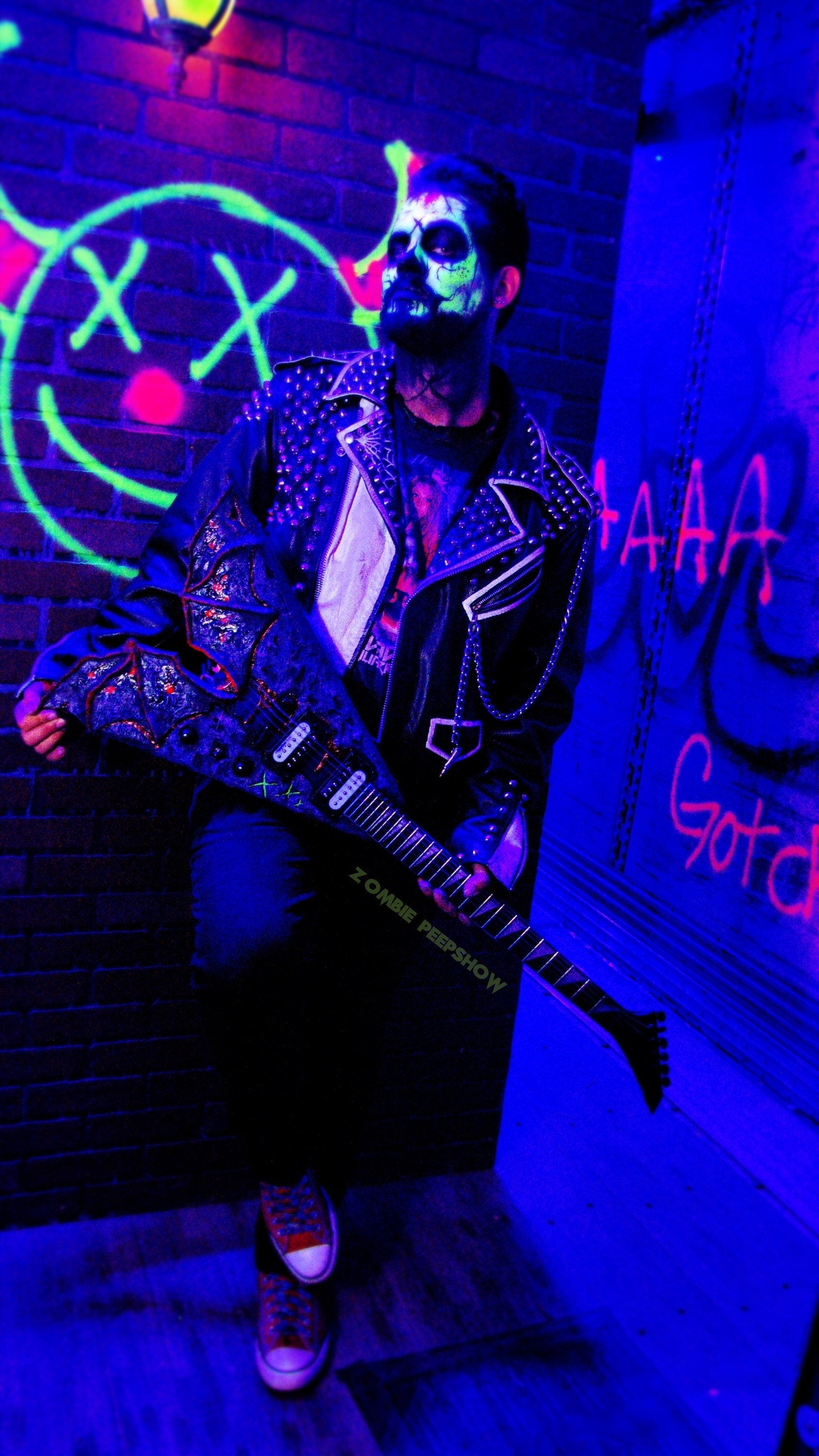 This bat wing guitar is fully functional and features sculpted hard cast bat wings. The base is distressed with soft latex for comfort and features led lights, UV paint, and metal.