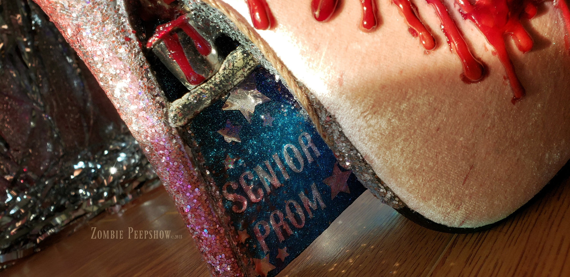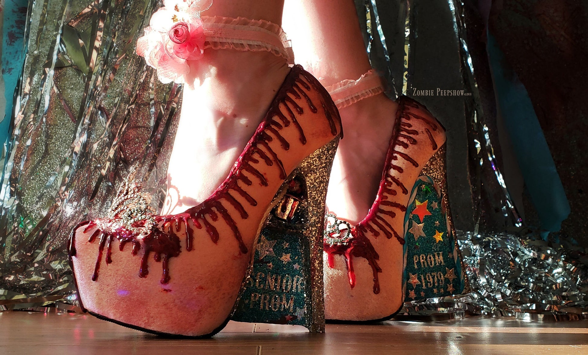 Prom Queen 1979 Pumps feature a pink velvet base, aged crown tiaras, blood drips, and prom scenes. We have crafted each scene to include a prom backdrop, bloody bucket, and glitter finish. Removable corsages with bloody floral accents are included.
