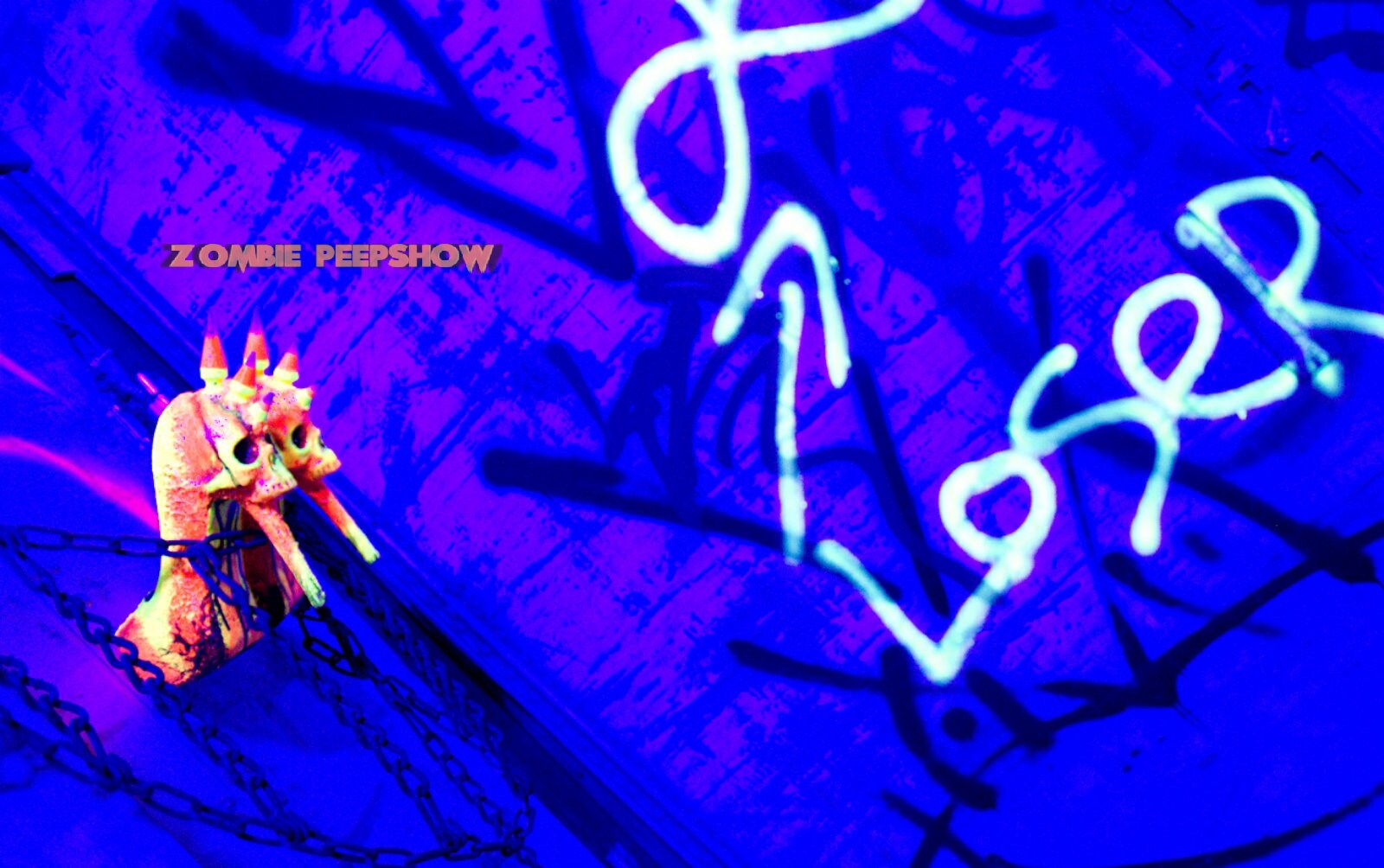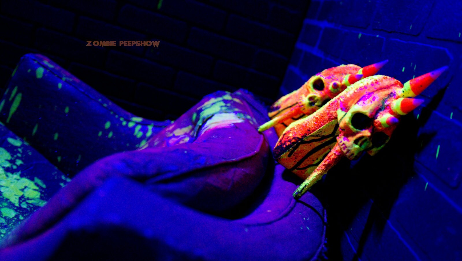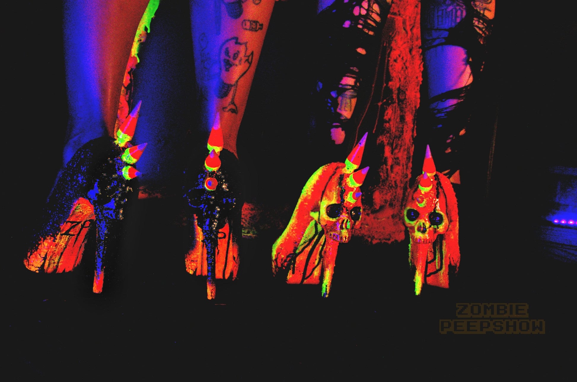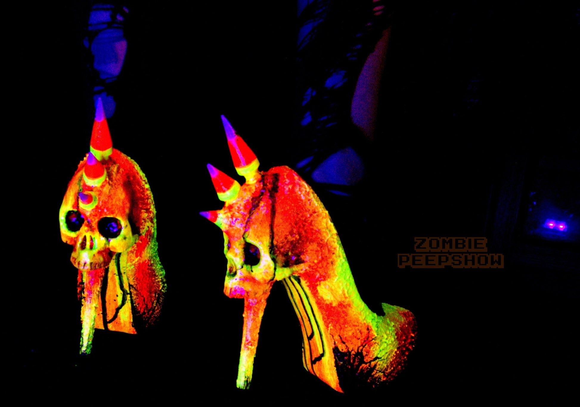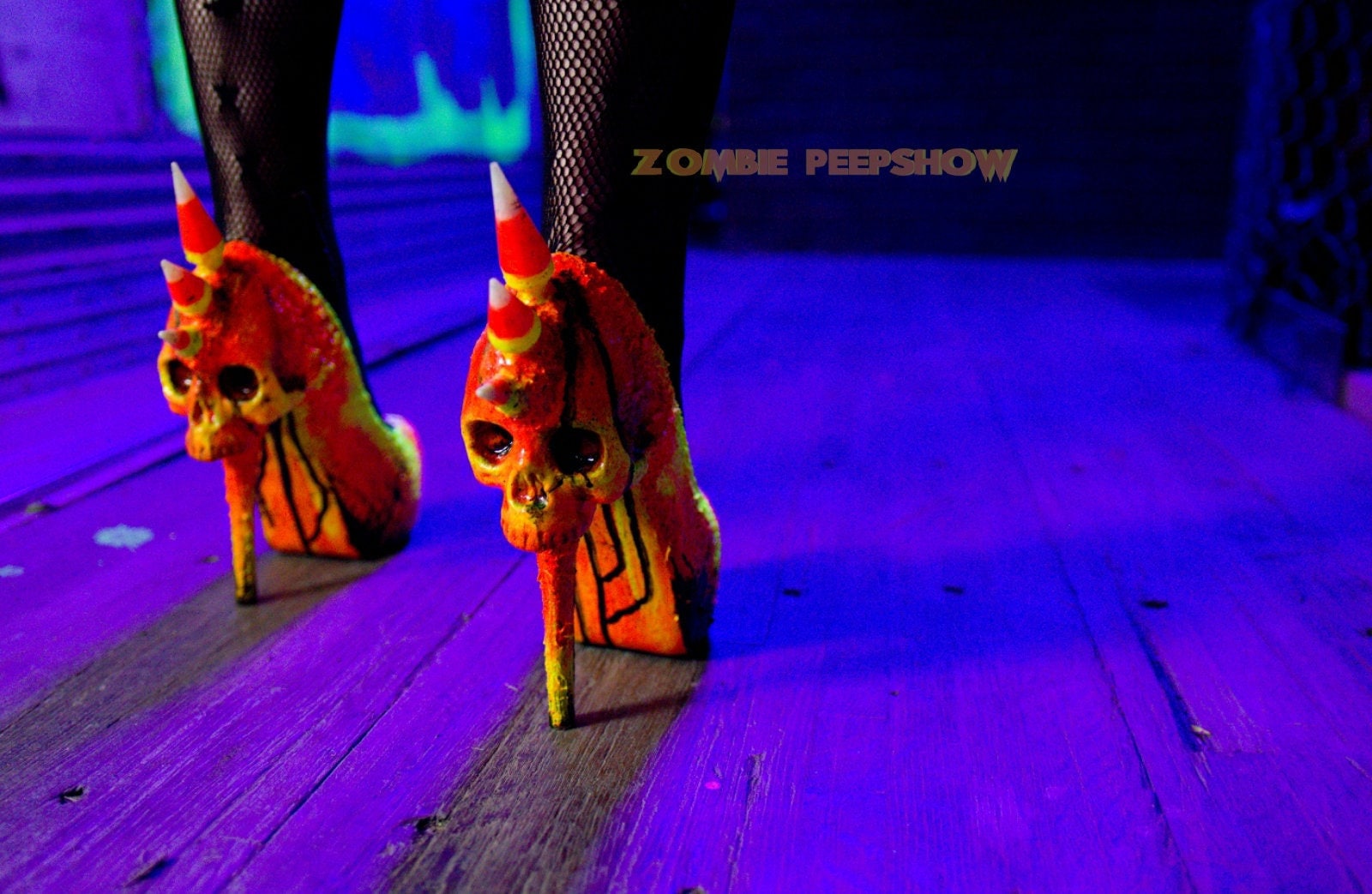 Candy Corn Purgatory pumps are hand painted and textured with sculpted skulls. The base has been covered in an assorted distressed UV paint mix. Each skull features a mohawk made of UV glow candy corn spikes.