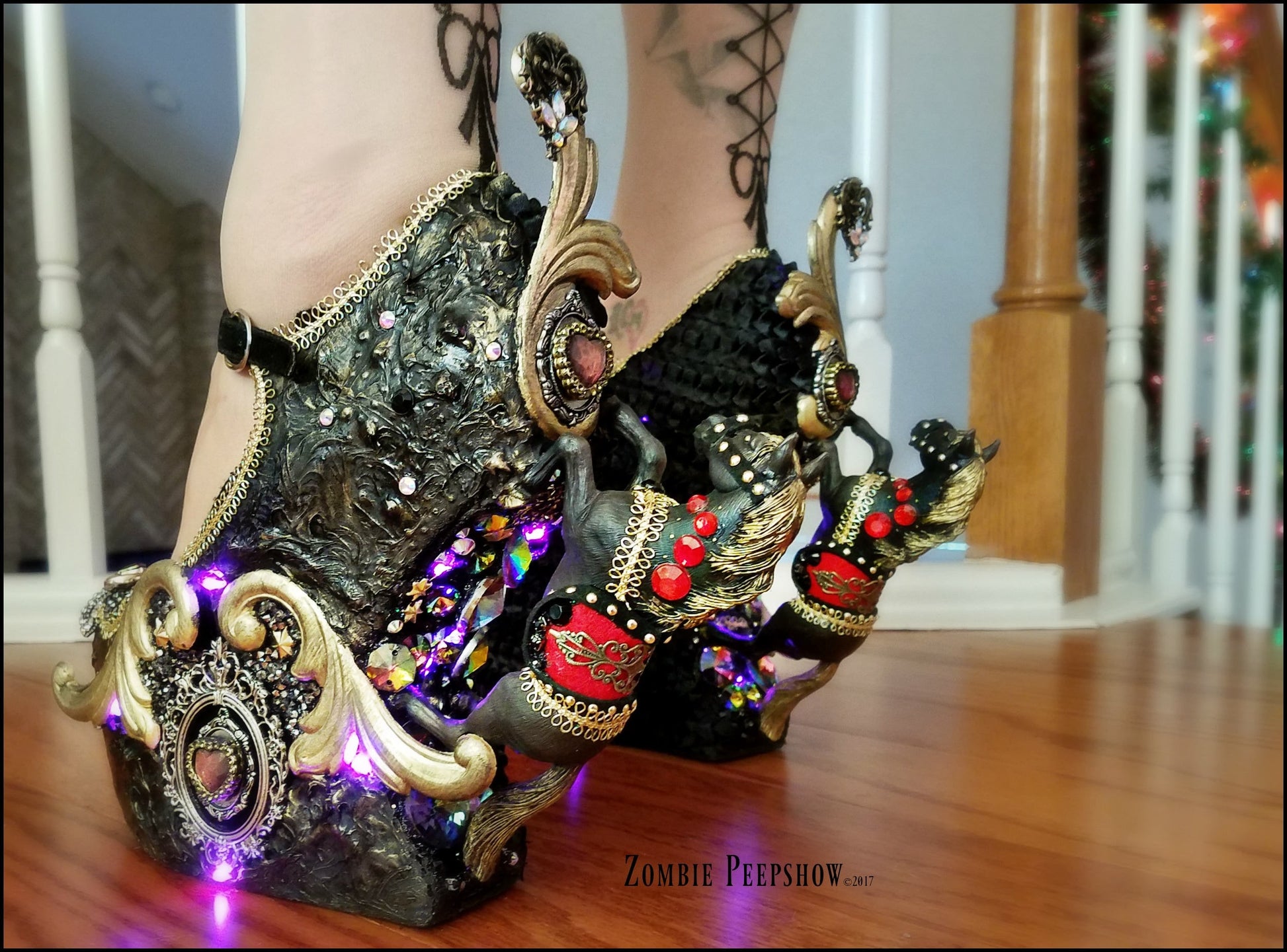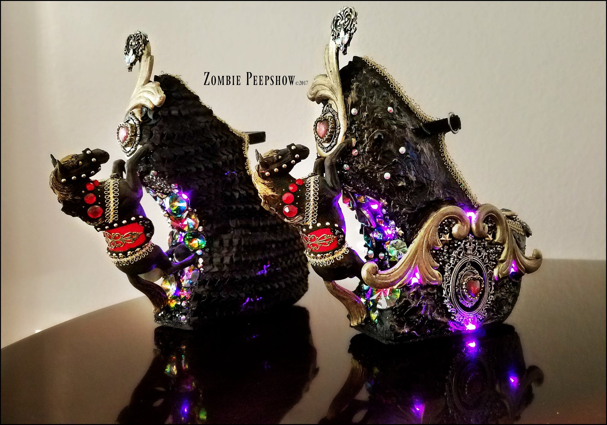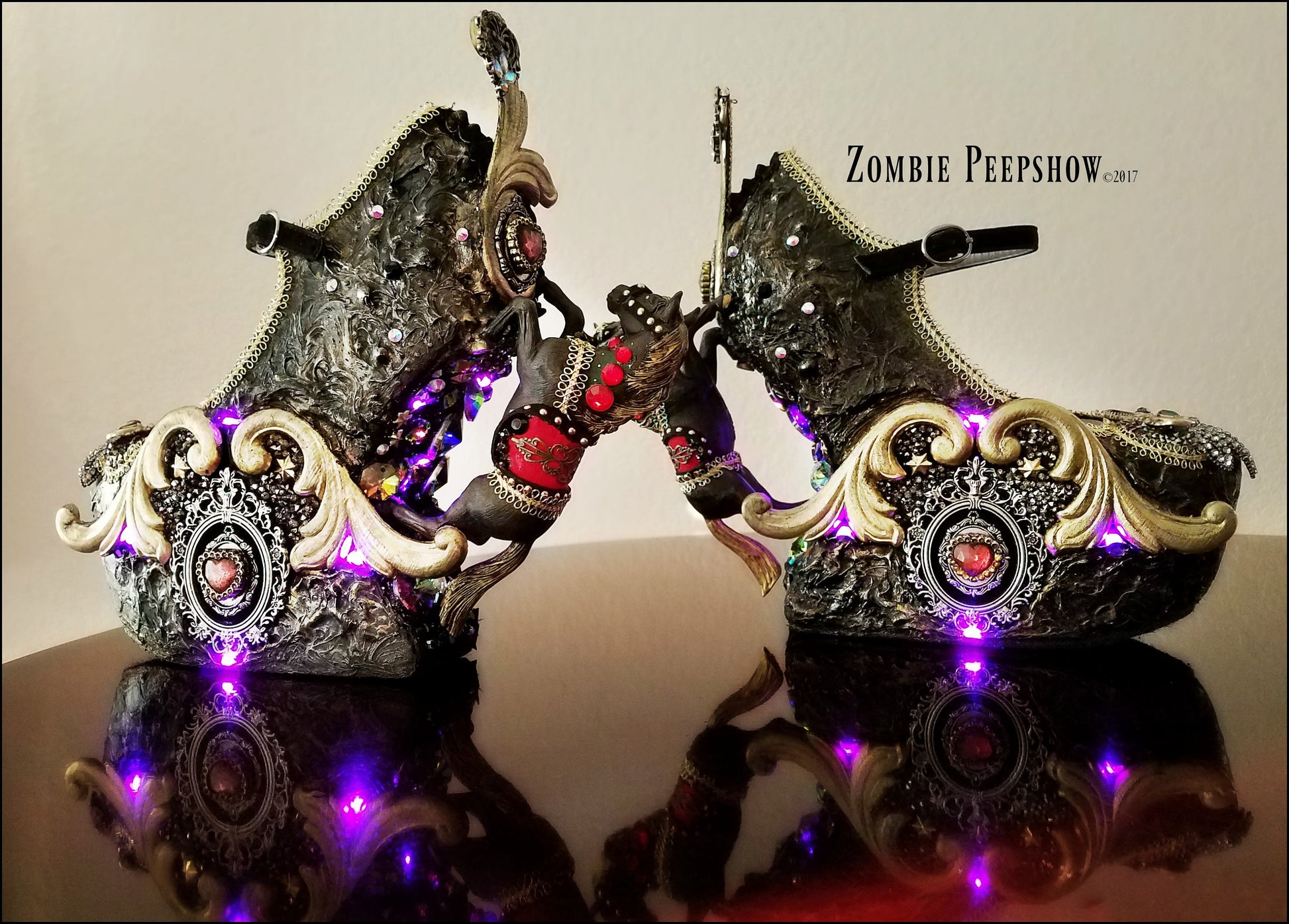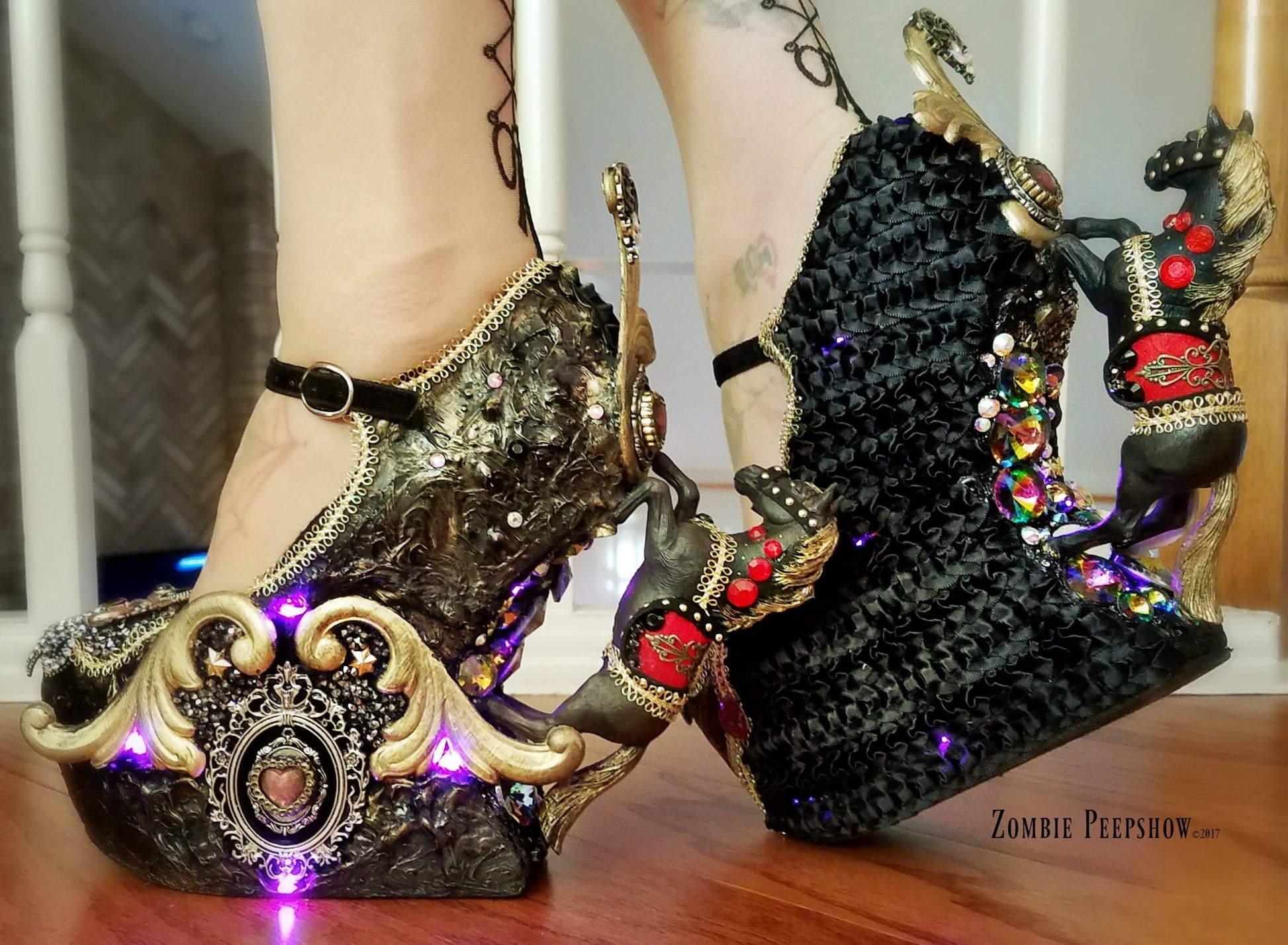 Carousel wedges are textured and have black satin ruffles. They feature mounted carousel horses with detailed adornments. Assorted crystal, filigree, and antique style pieces are used throughout.