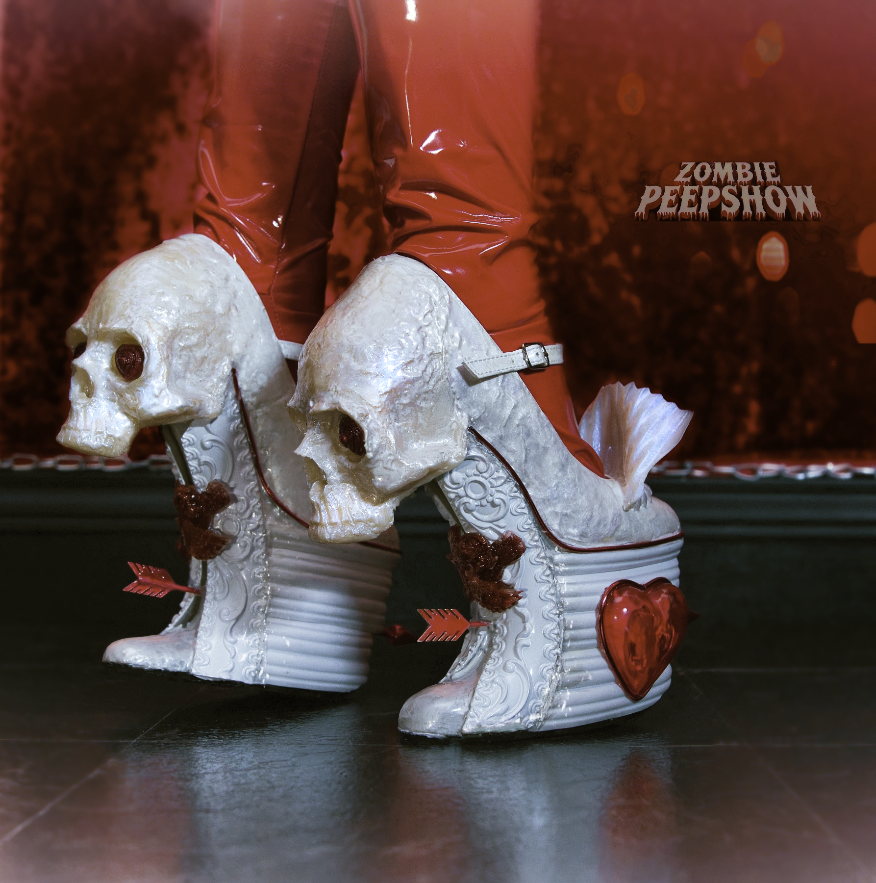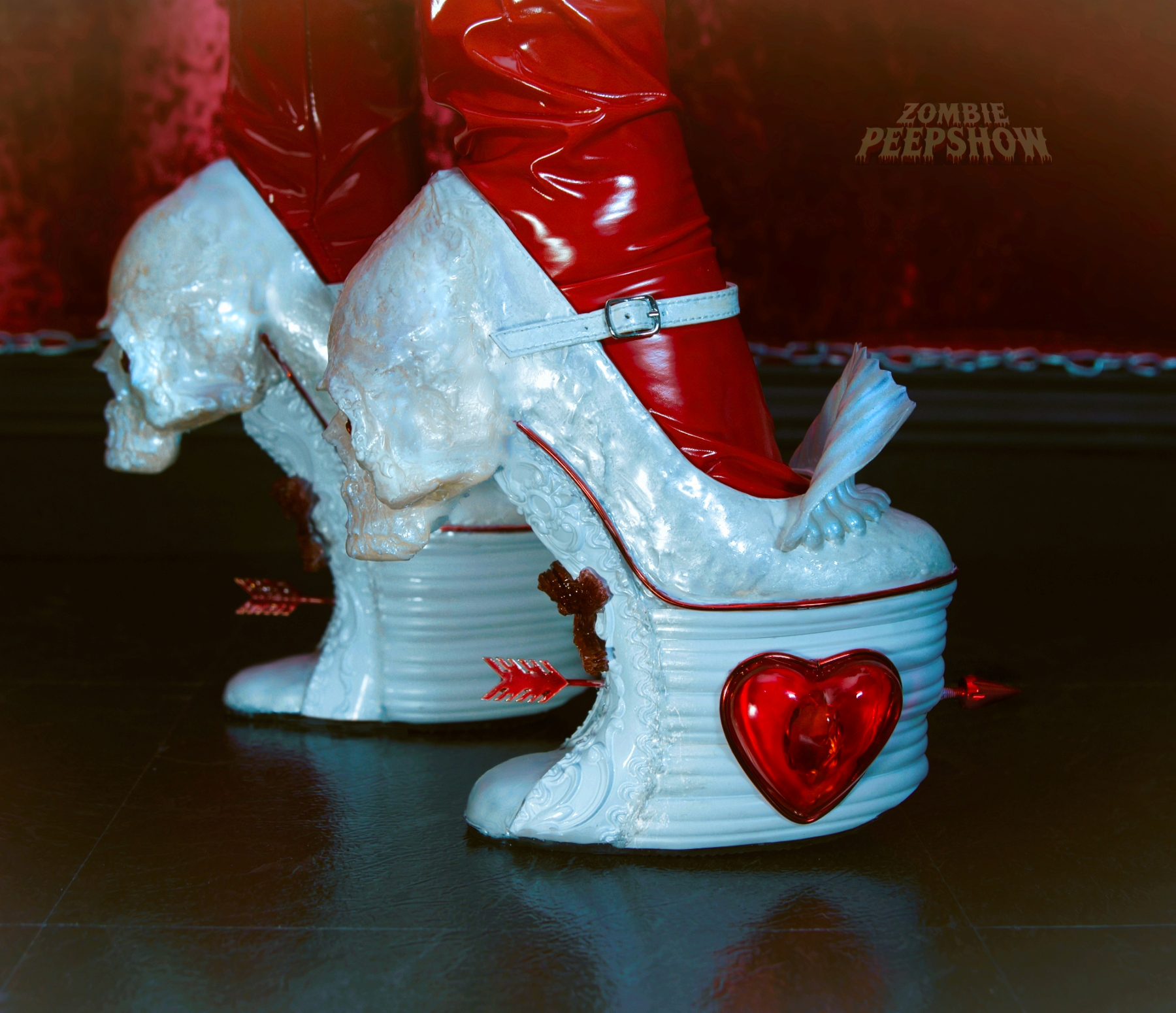 Casanova wedges feature skulls, cupids, bow and spike arrow, with marble finish. A shiny acrylic heart encasing a crystal adorns the lower platform. Sculpted heart pendants rest in each eye.