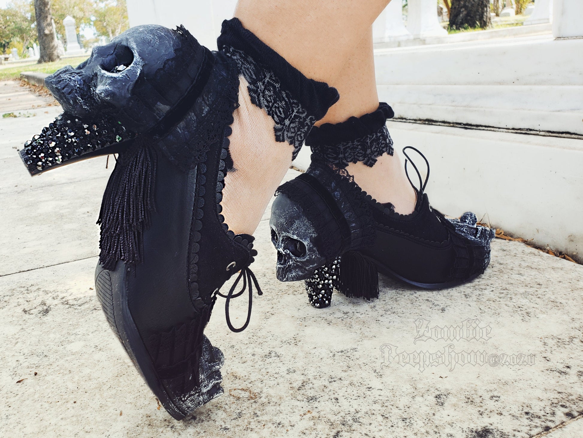 Victorian Mourning Heels feature sculpted skulls and a crystal encrusted heel. Each shoe is adorned with gothic trims, sculpted toe centerpieces, and a fringe sole. Lace socks are included and may vary slightly.