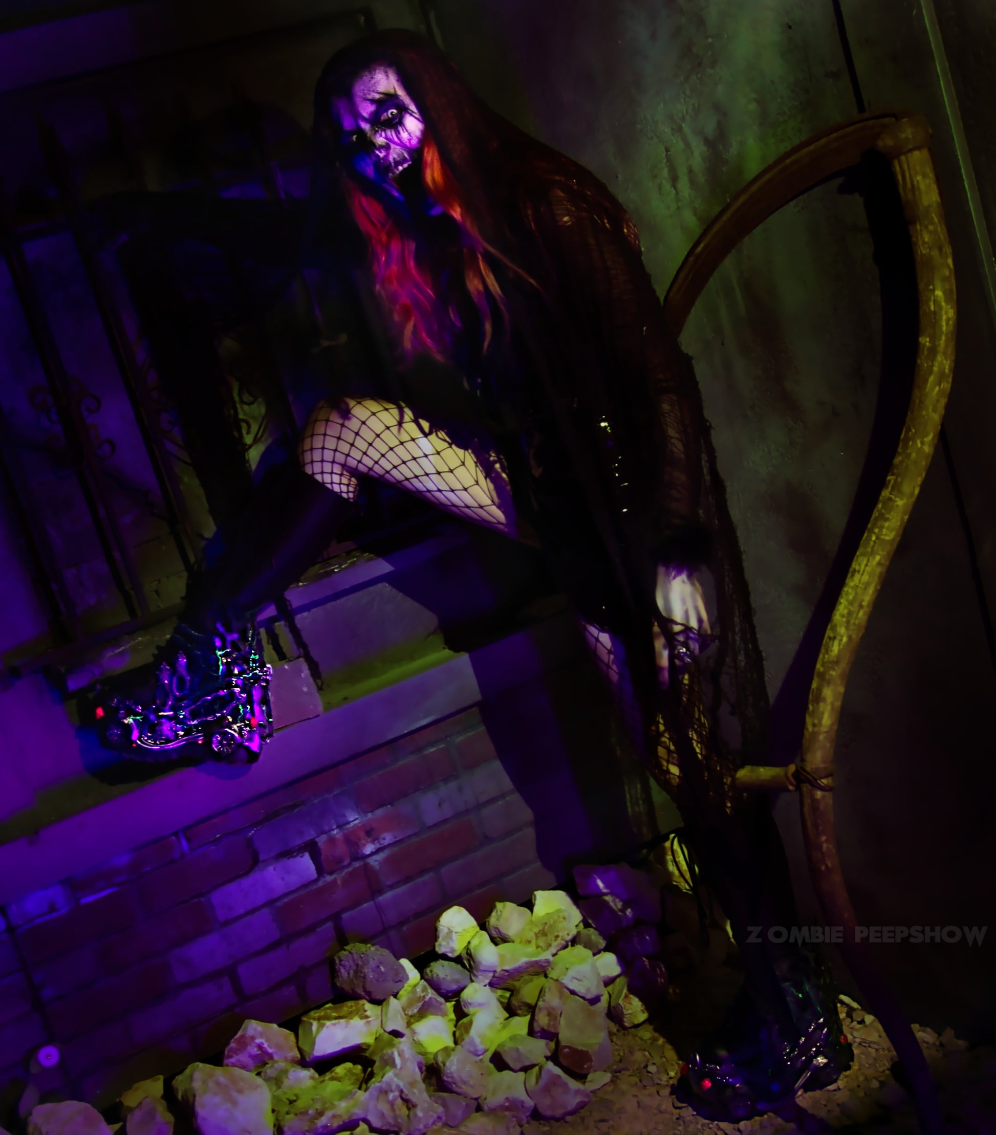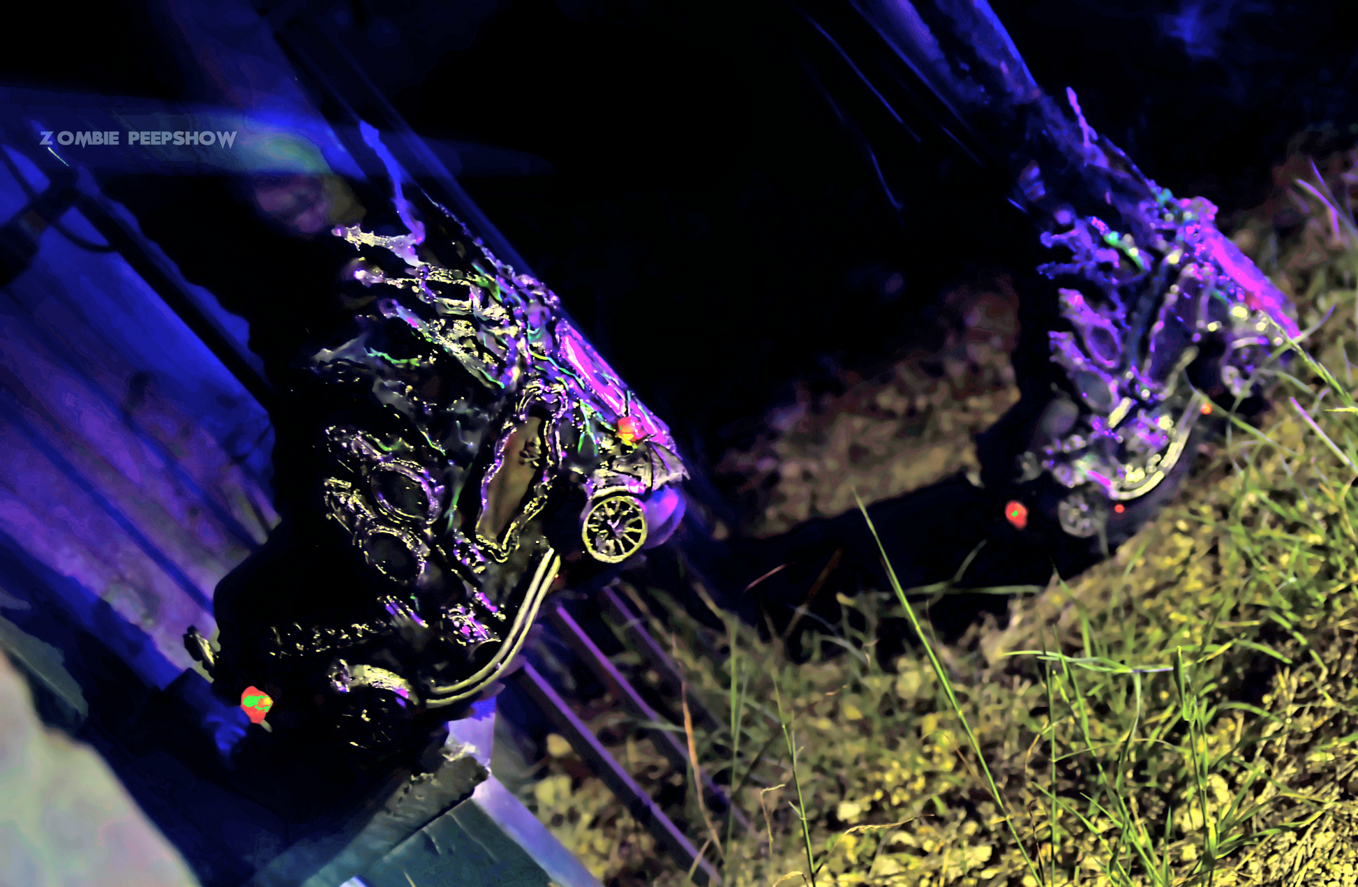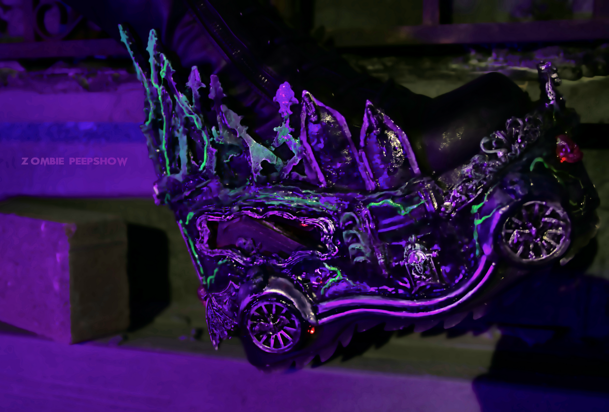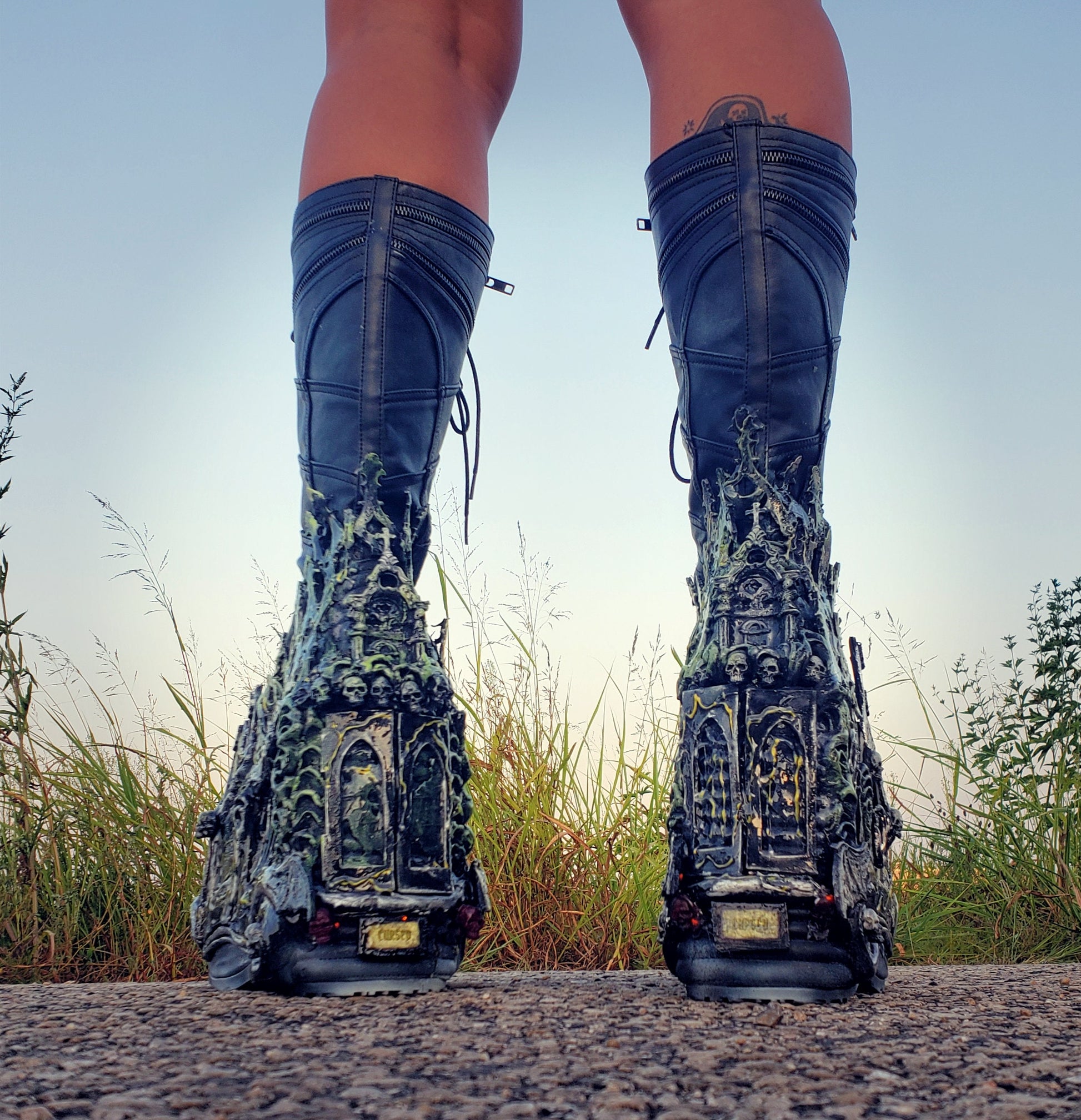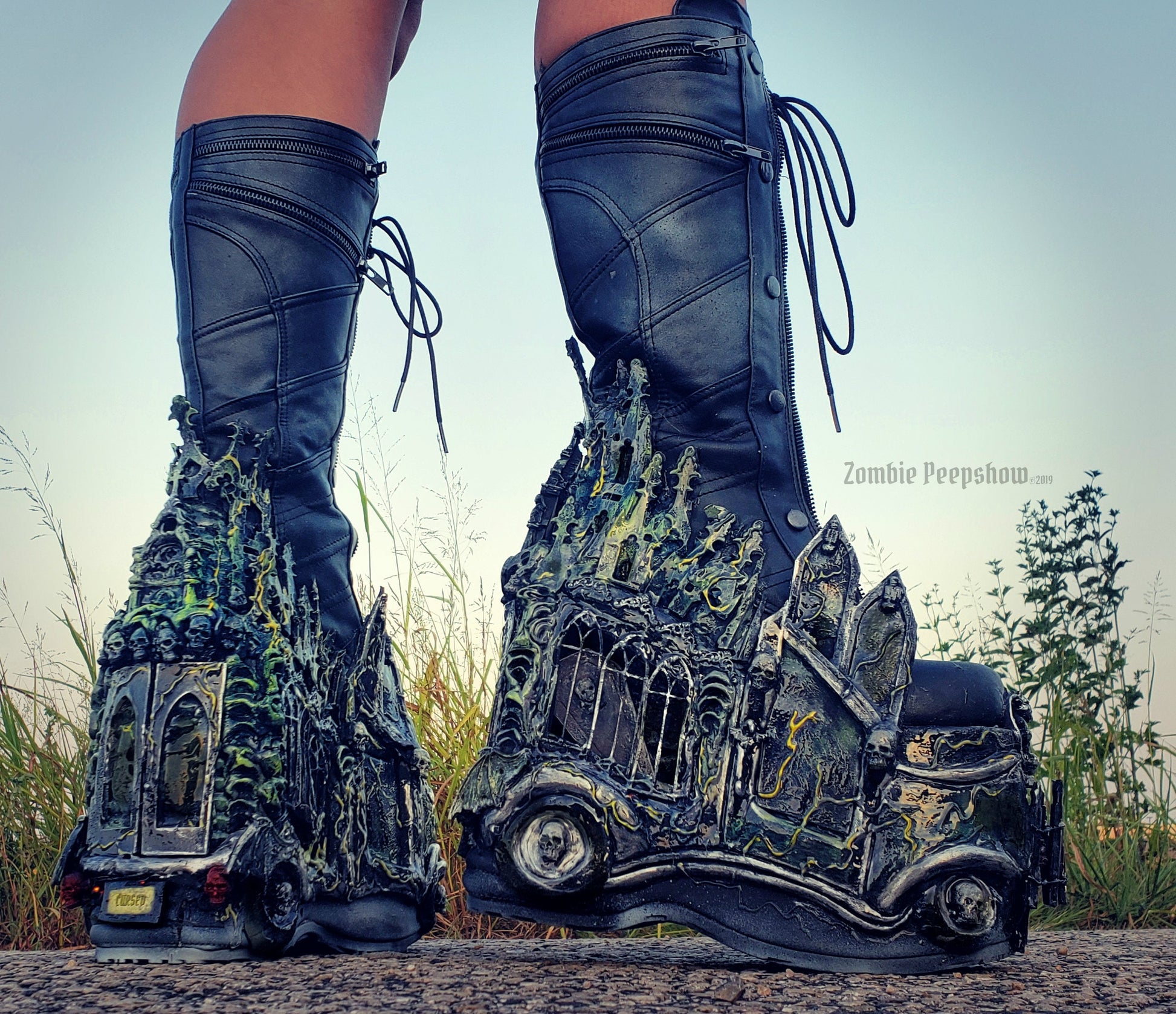 Cursed Hearse platform boots feature hand sculpted hearses. Ornate window trims, sculpted cathedral features, coffins, and other detail can be seen throughout. Each shoe has LED lights. Hearse features will vary between each pair we make.