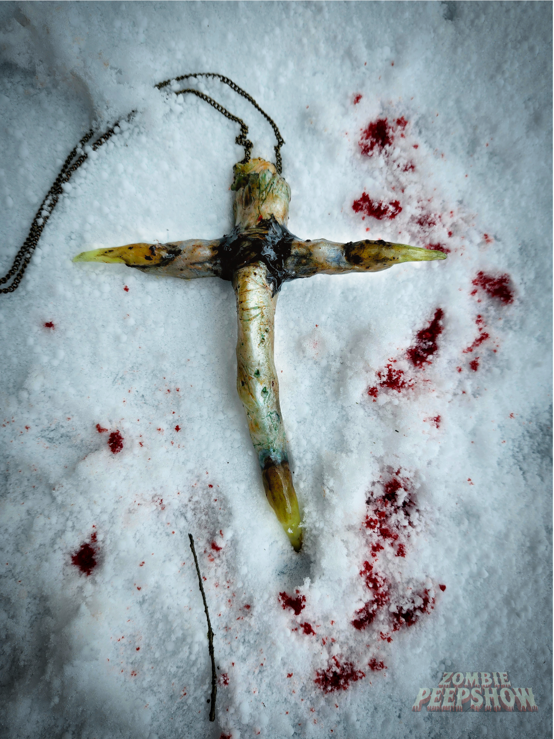 Dansferatu Vampire necklace is a 3 piece handmade accessory. It features a velvet winged collar with latex flesh. A separate sculpted bow tie with sculpted heart pendant is layered on top. The sculpted vampire finger crucifix necklace rounds out the trio, with UV nails.