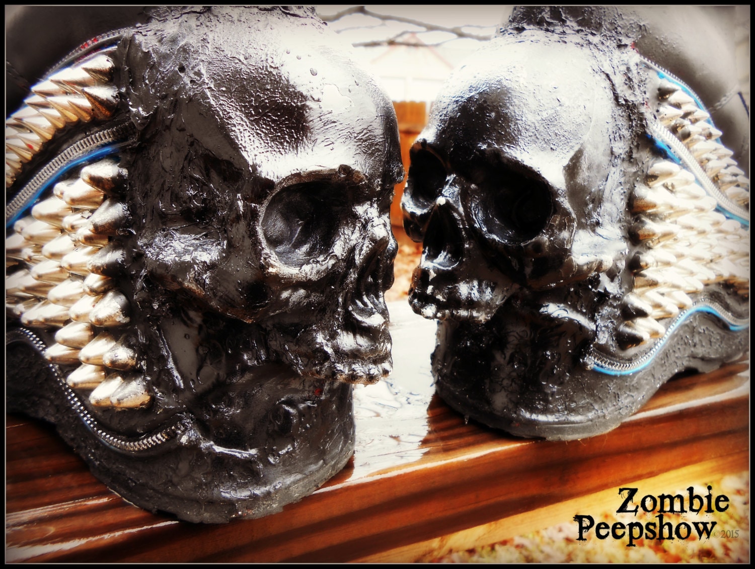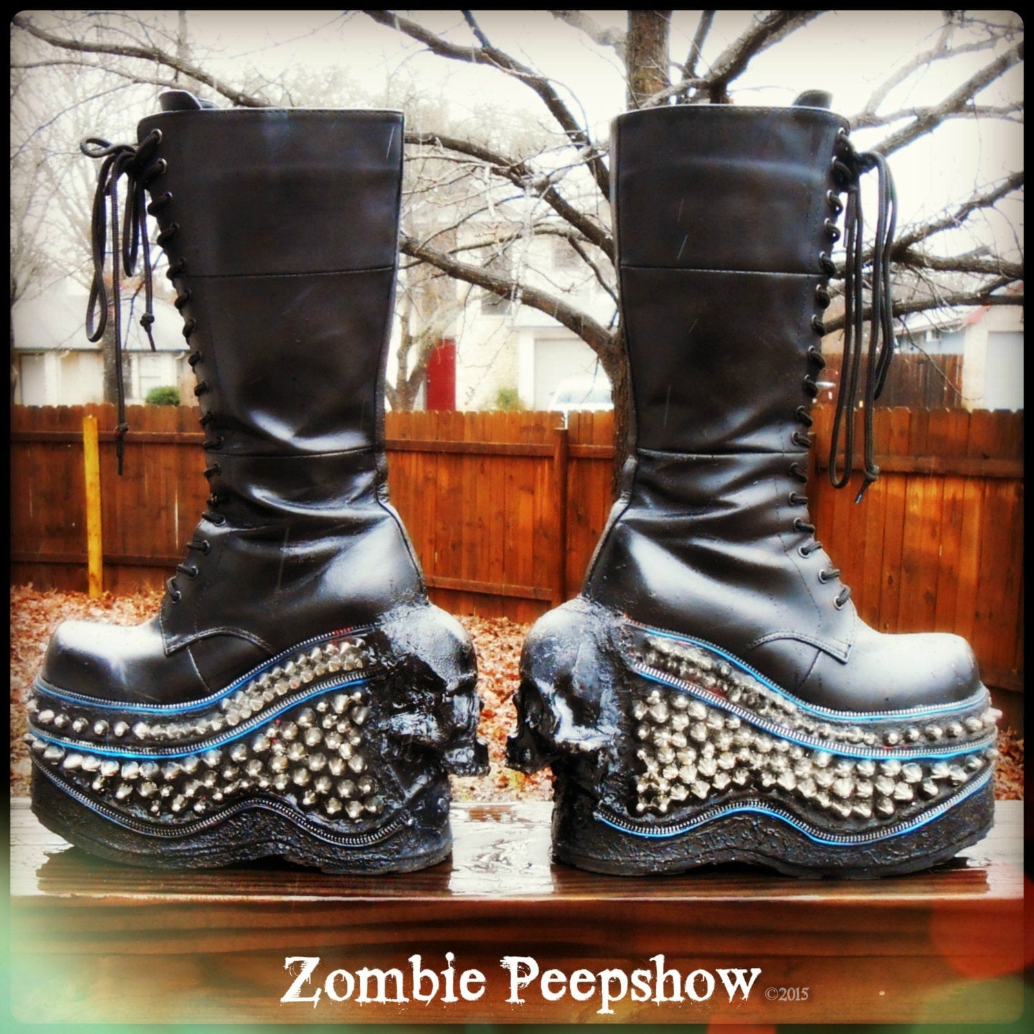 These Death platform boots are hand painted and textured with large skulls. They feature studs, spikes, and optional LED lights