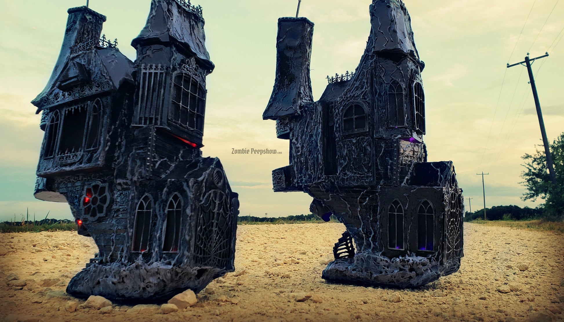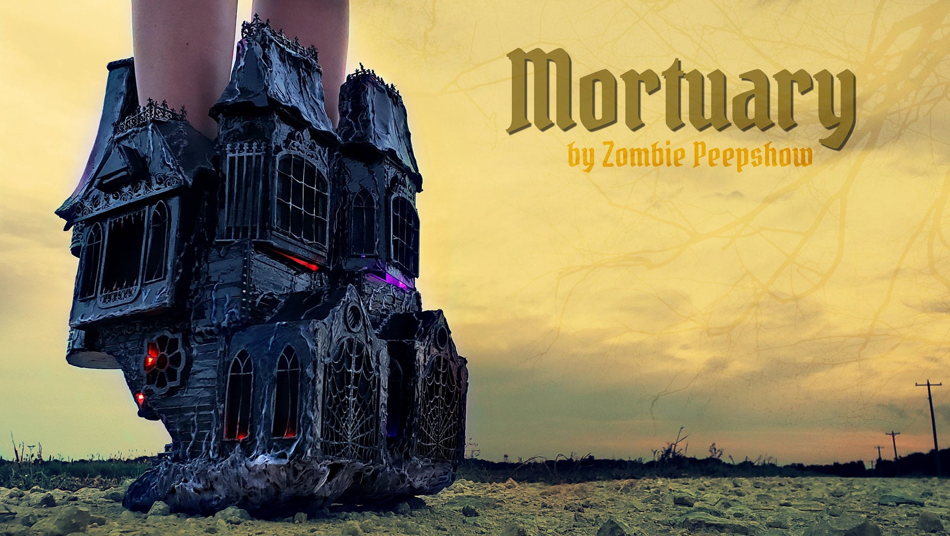 Mortuary Boots feature hand built houses. Each shoe is constructed from the ground up with lightweight wood, foam, and other industrial materials. Ornate window trims, sculpted siding, intricate web doors, and spiral staircase can be seen throughout. LED lights illuminate the windows. One back balcony has a miniature gramophone. This shoe has a speaker that plays ominous funeral organ music.