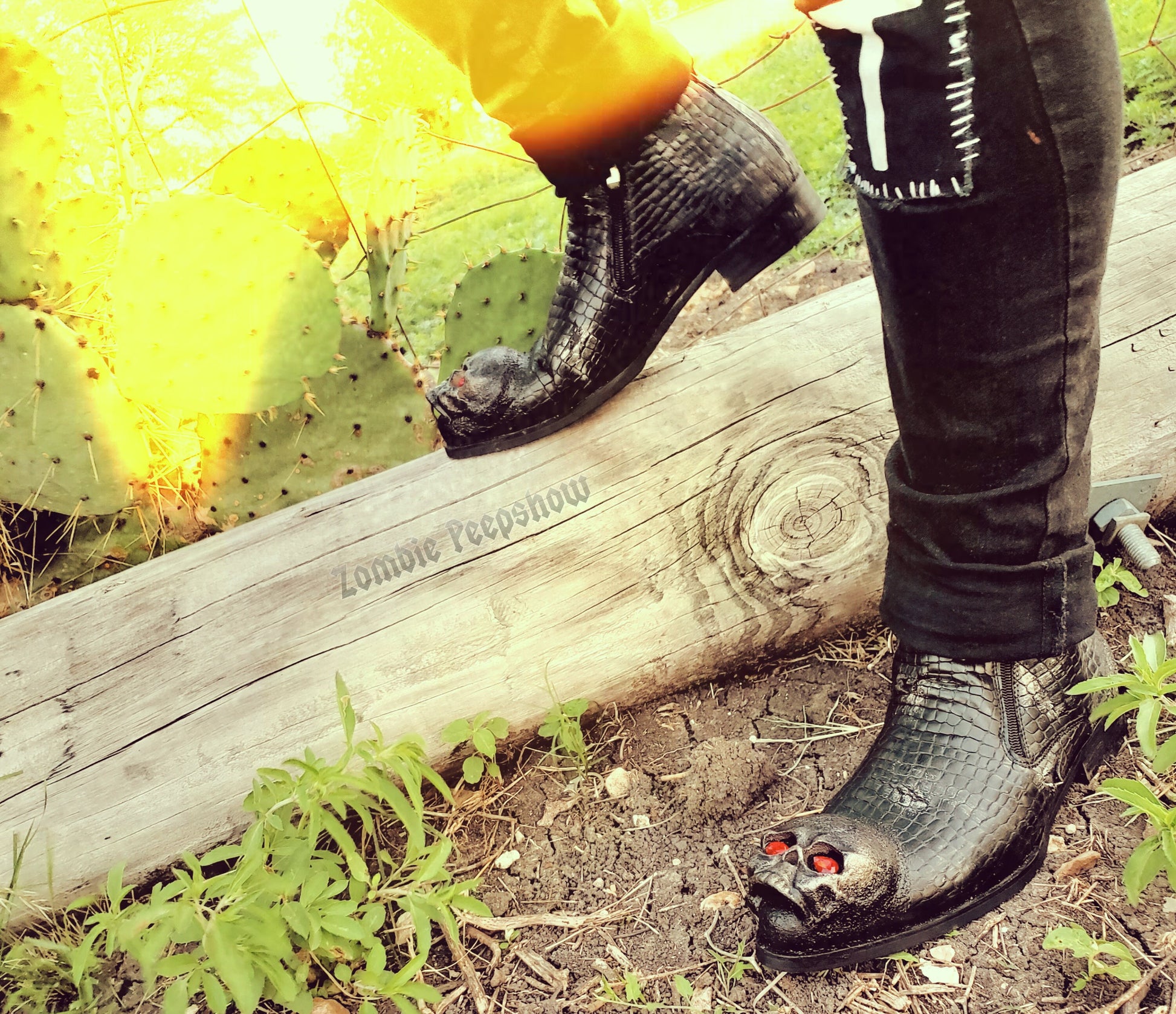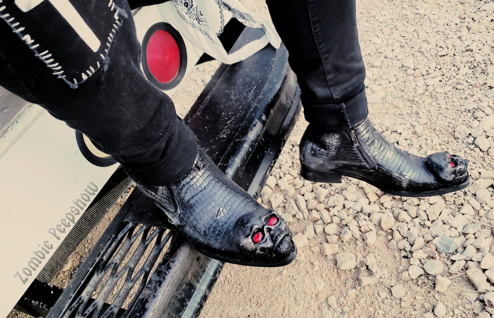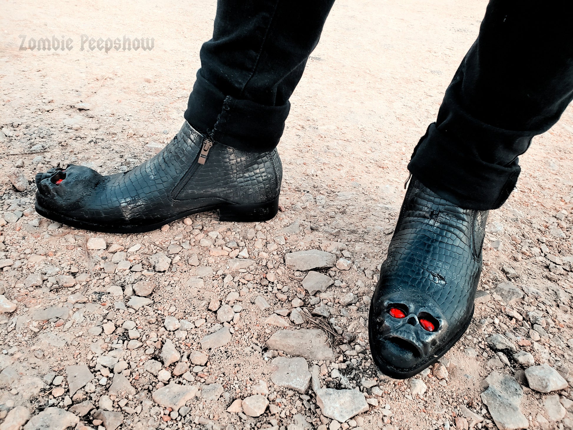 Diablo boots are hand painted and textured. Each shoe features metal skull toe caps with red crystal eyes, and a distressed base.