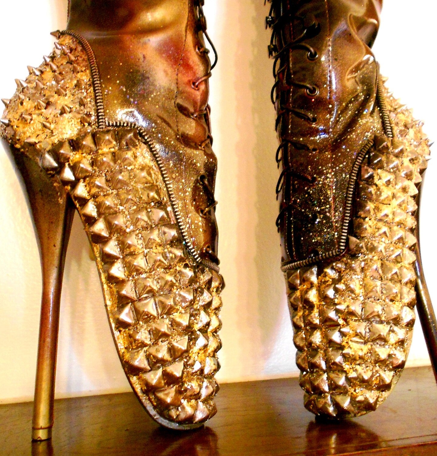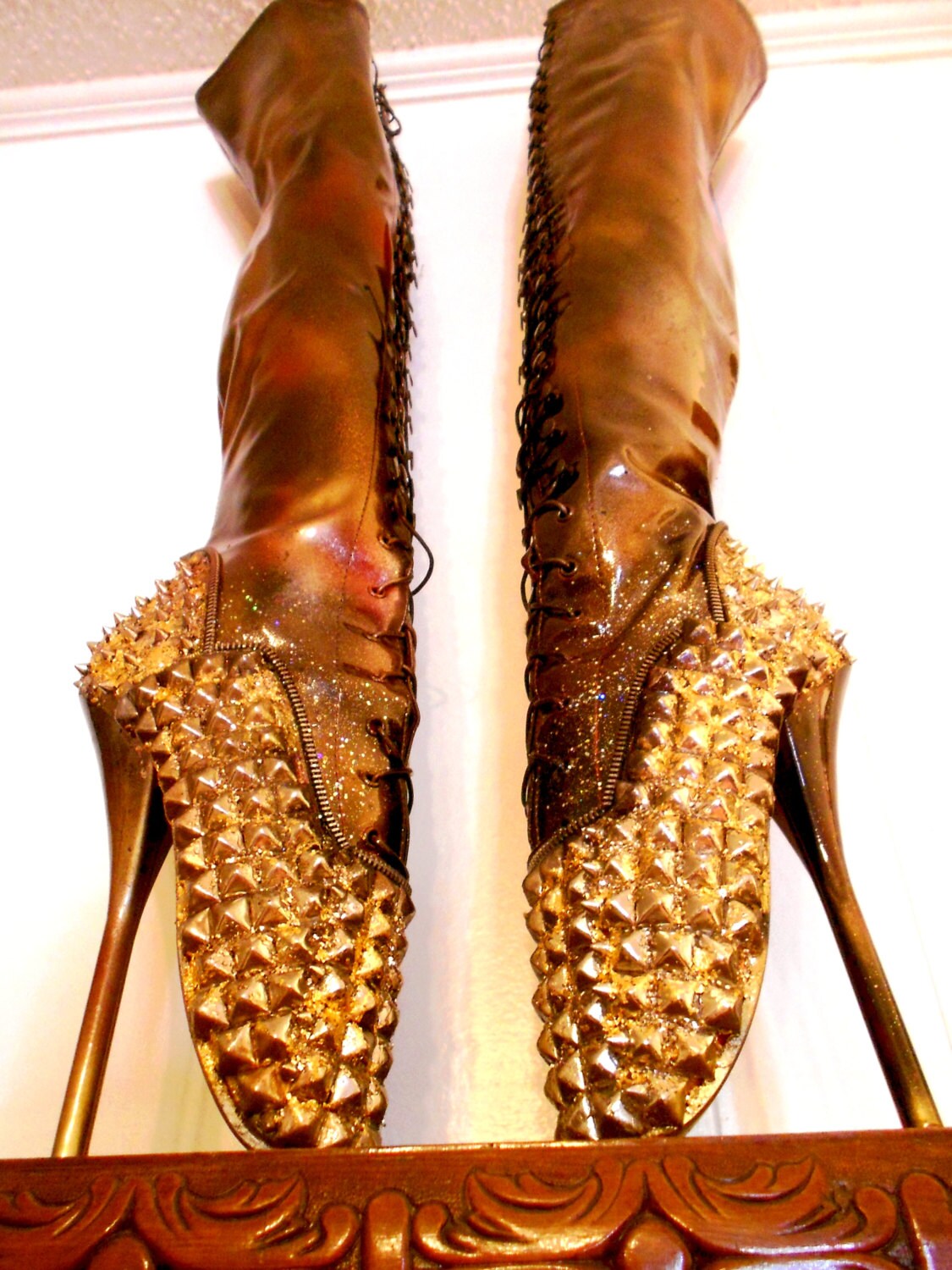 Gasoline thigh-high fetish ballet heels have a studded platform. Distressed paint and gold leaf are used throughout.