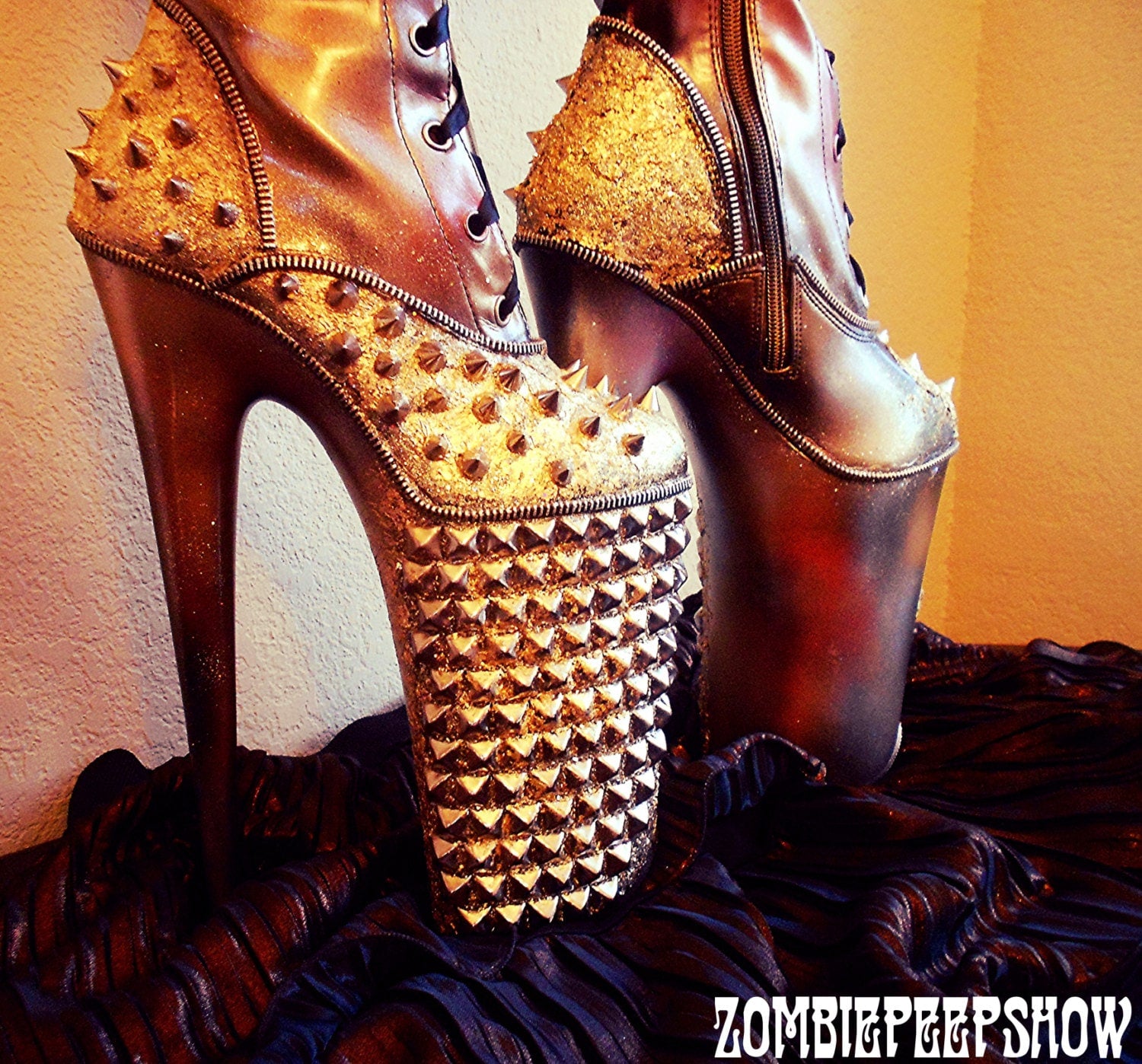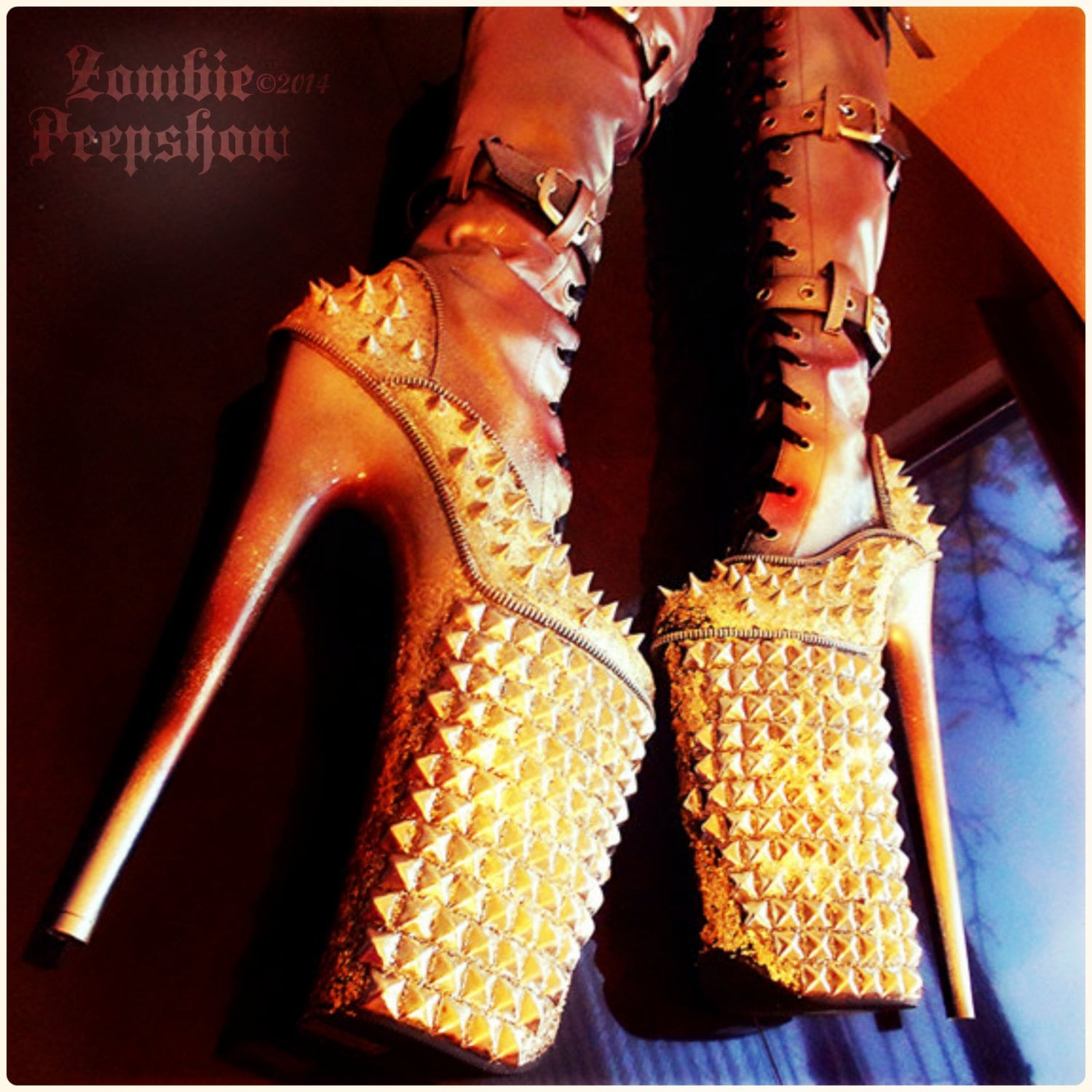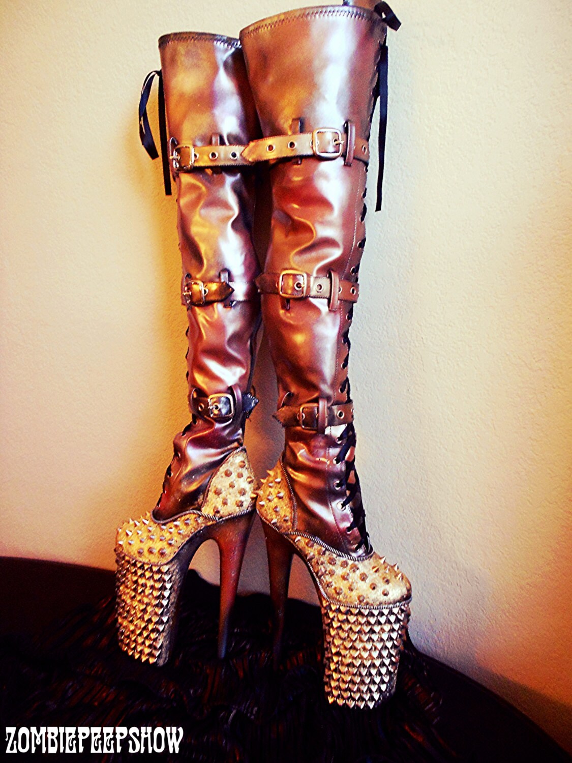 Gasoline II thigh-high fetish boots have a studded platform Distressed paint, spikes, and gold leaf are used throughout.