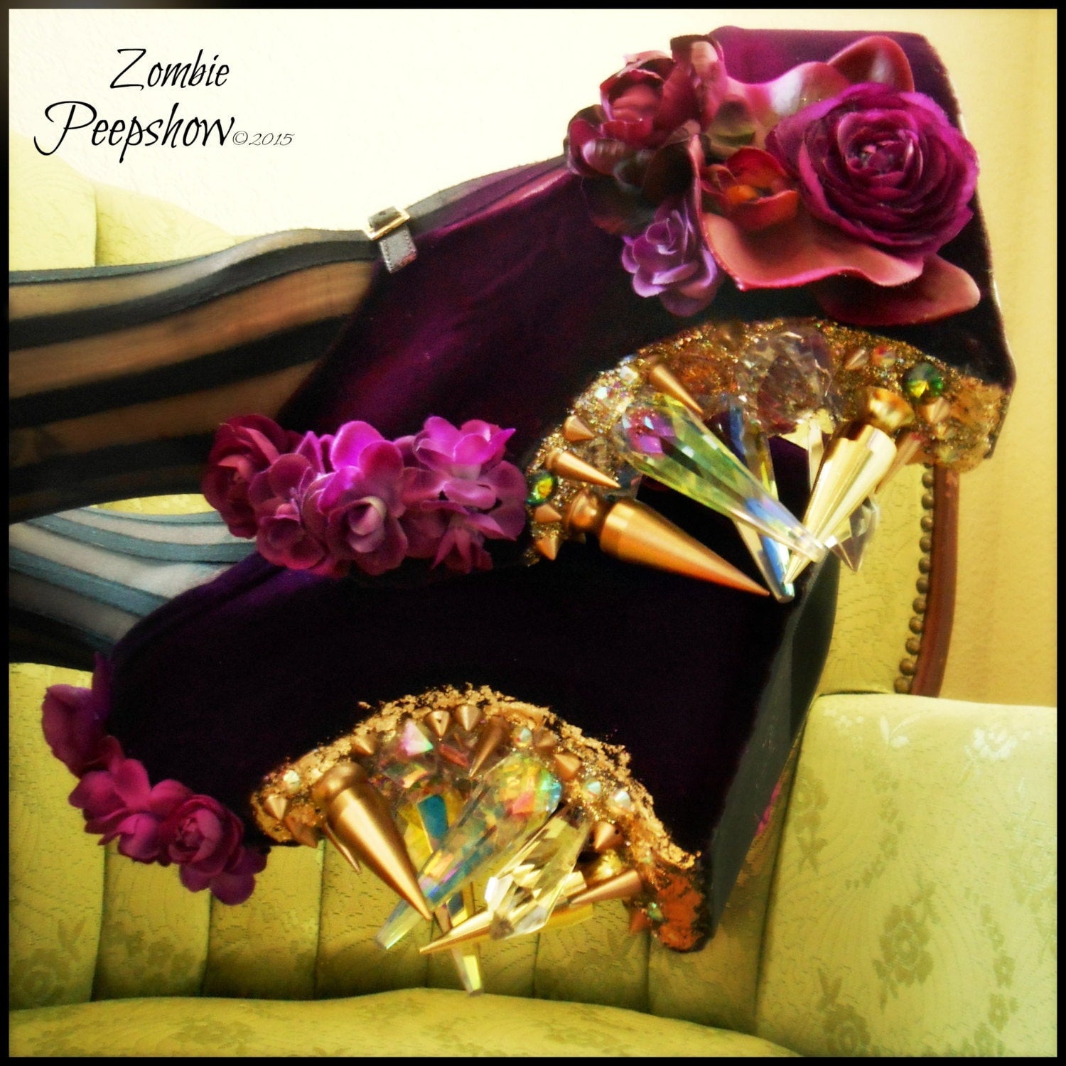 Orchadia wedges feature purple velvet, crystal prisms, and steel spikes. Assorted flowers rest atop the velvet. Gold leaf dresses the ornate detailed back.