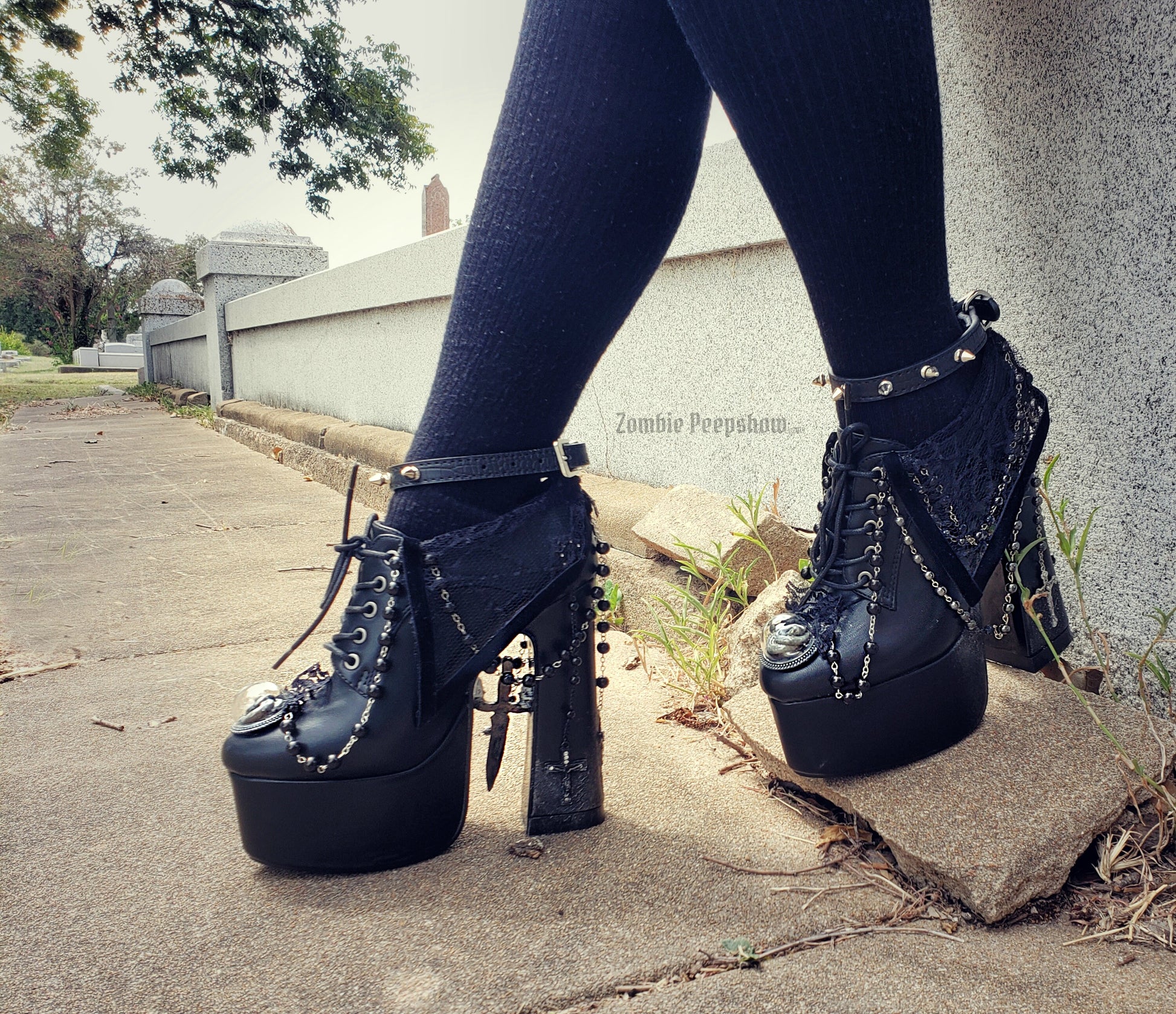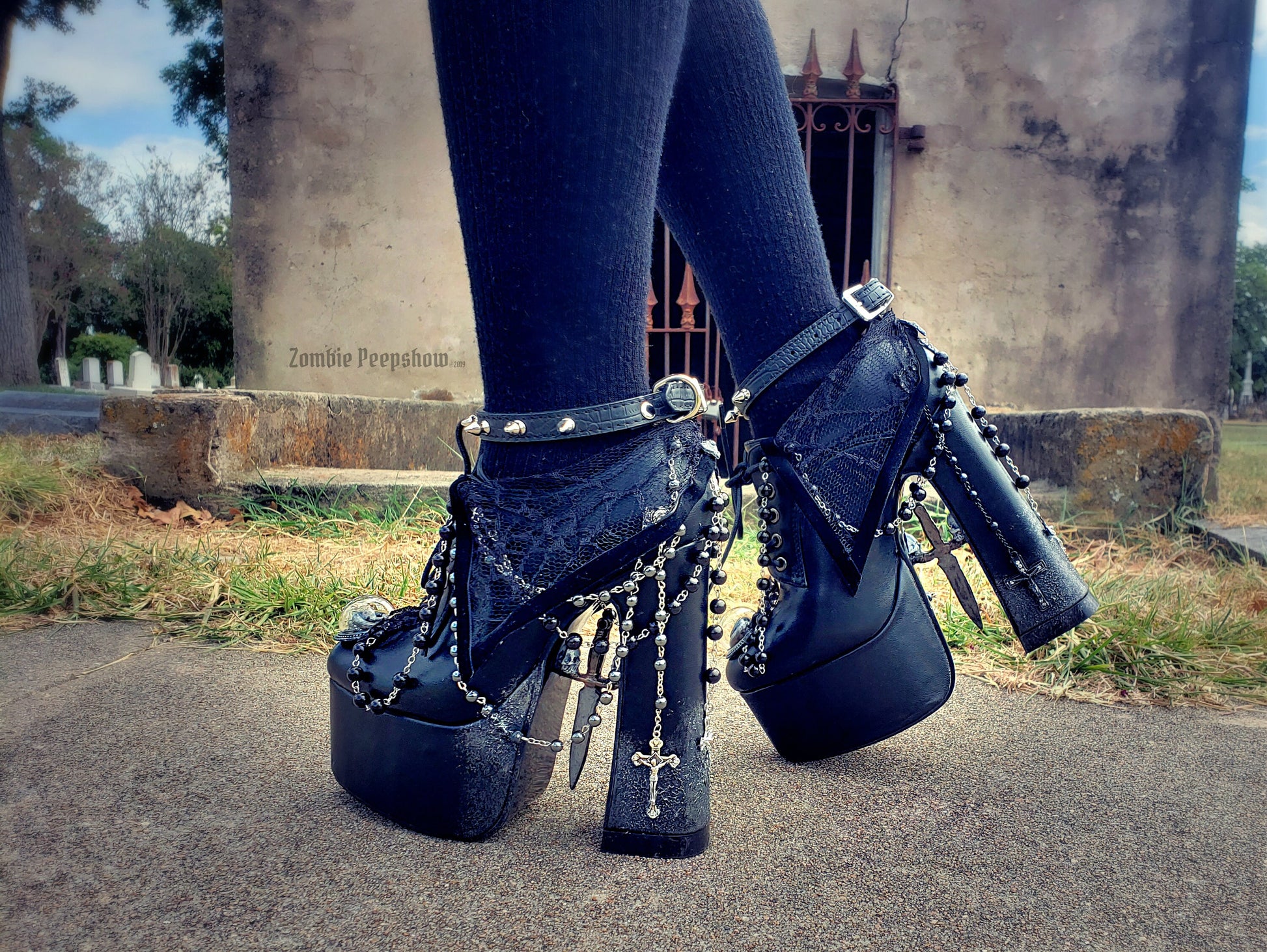 Nancy boots are detailed with draped rosaries and lace collars. Small sculpted snakes rest inside clear domes on the toes, while faux skull daggers under the back sole. Spiked ankle collars attached.