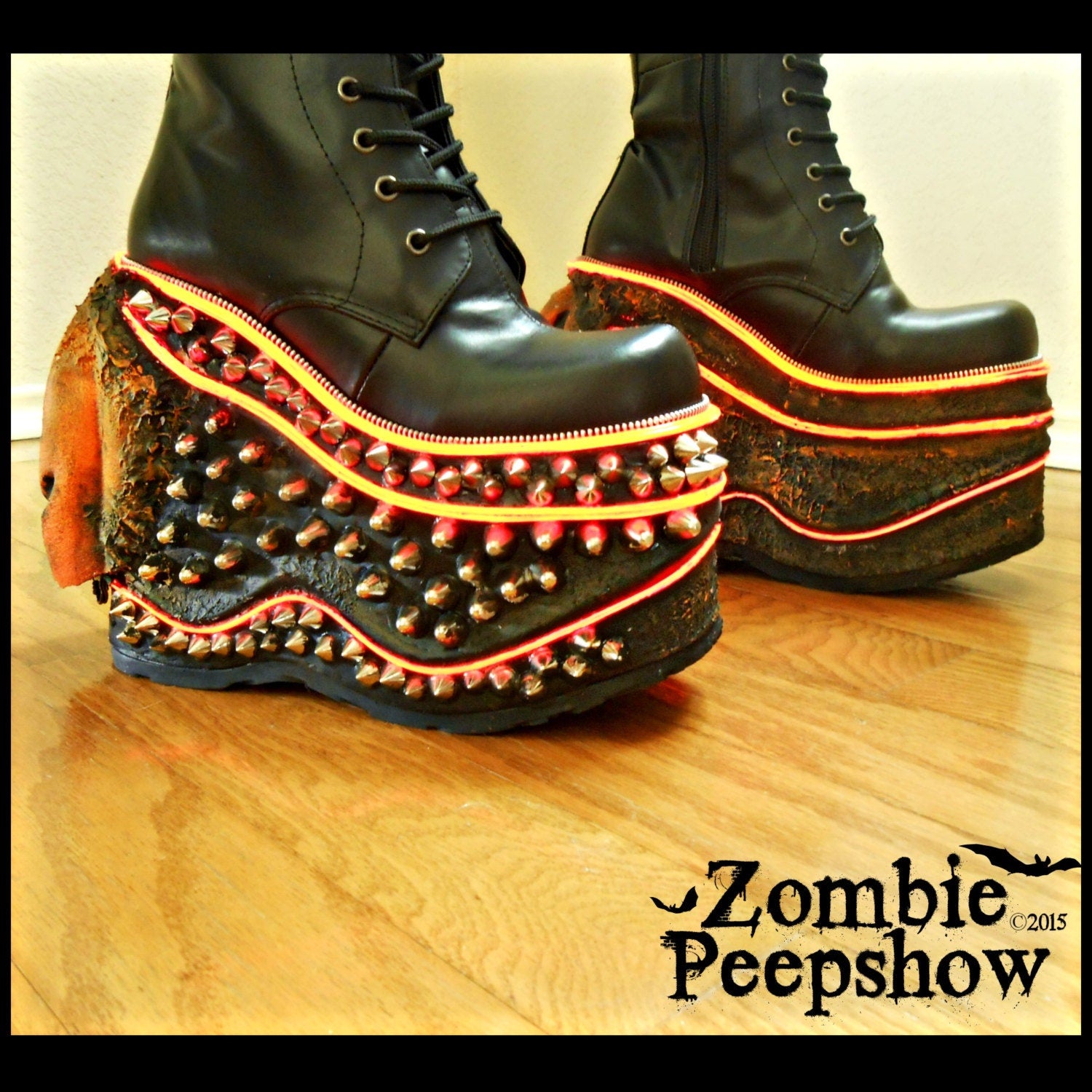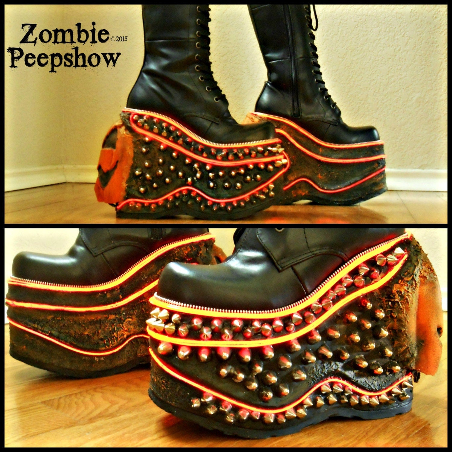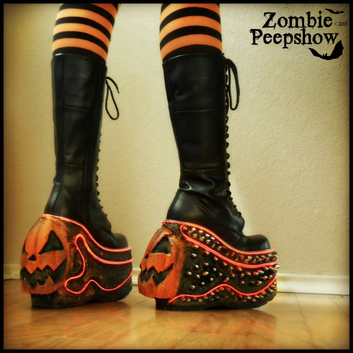 These Jack-o-lantern platform boots are hand painted and textured with large pumpkins. They feature studs, spikes, and other custom detail.