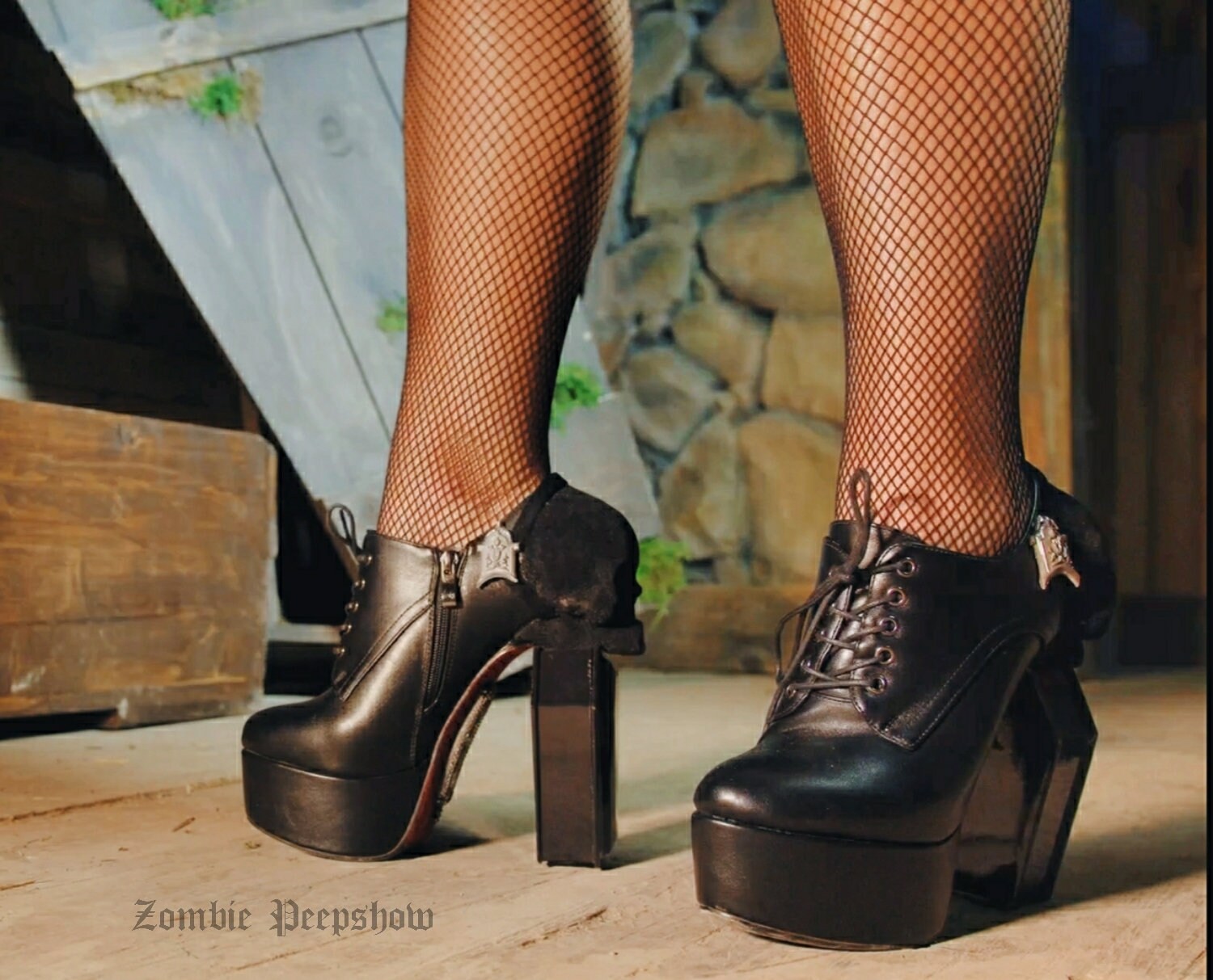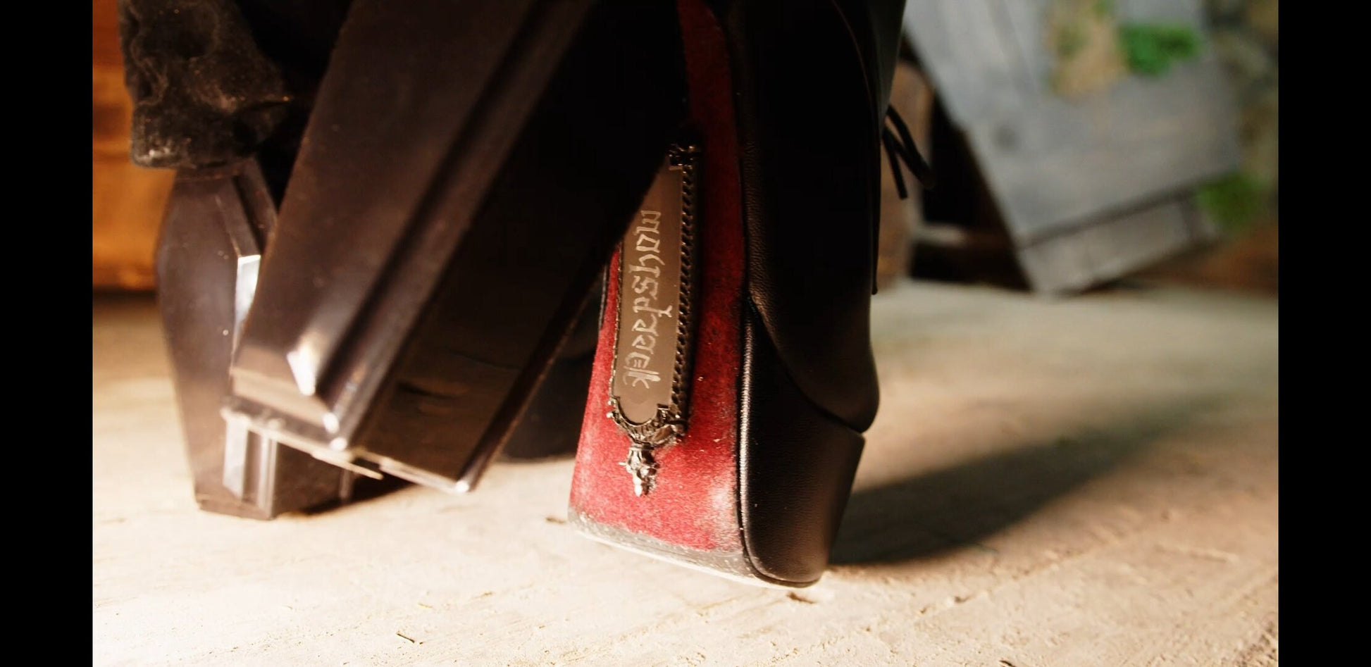 Lugosi boots feature hand casted coffin heels, velvet Purgatory skulls, and coffin plate detail. The sole has a velvet base with optional custom color and script.