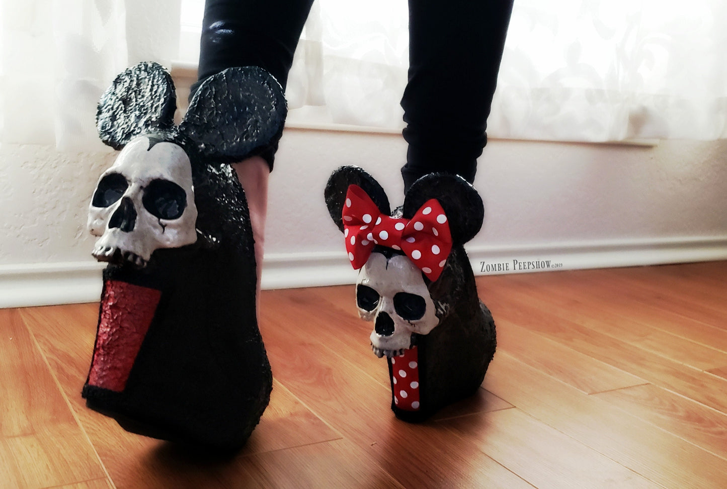 Till Death Do Us Part Wedges are hand painted and textured with skulls. Each shoe features mouse ears and colored features.
