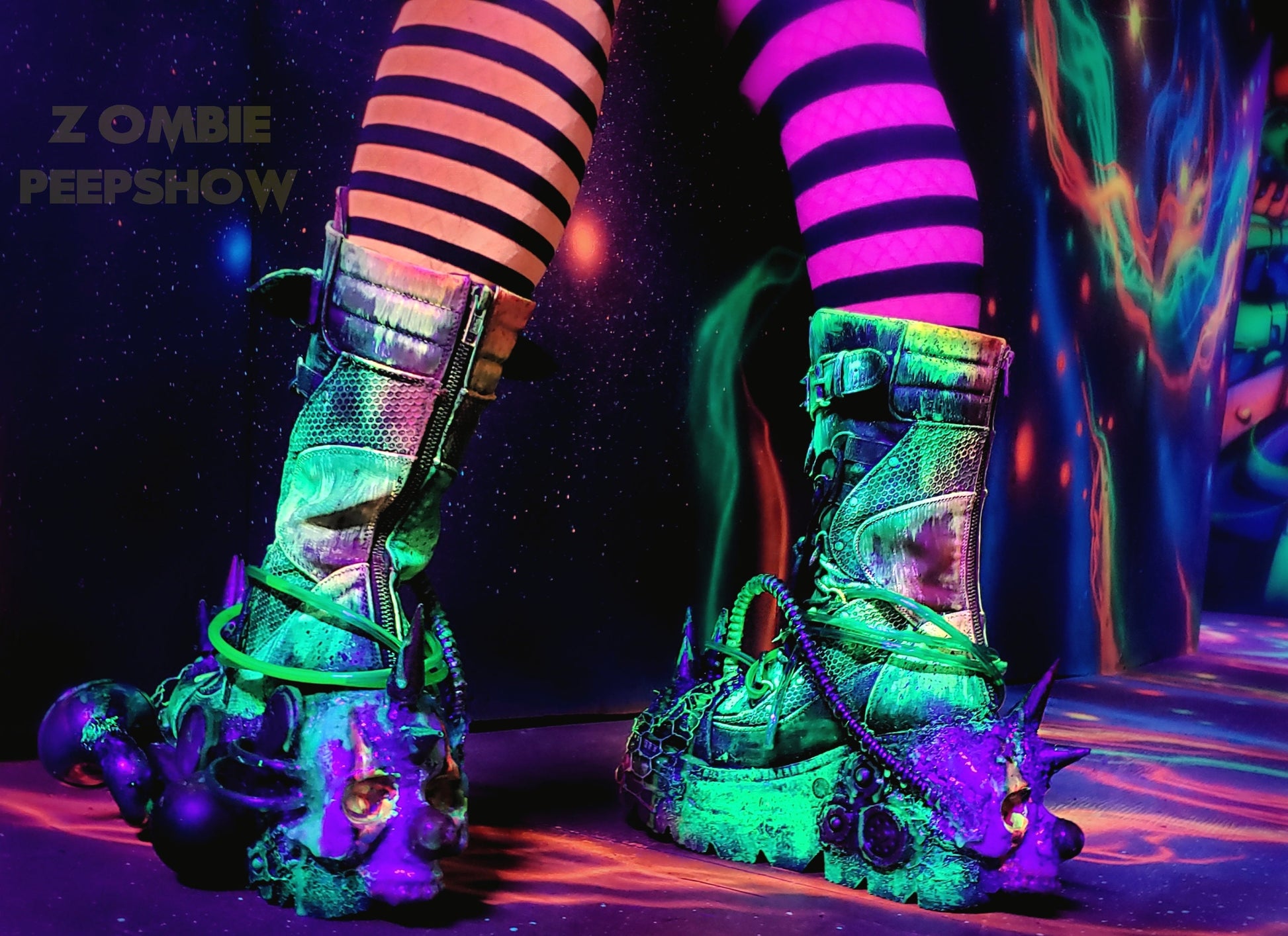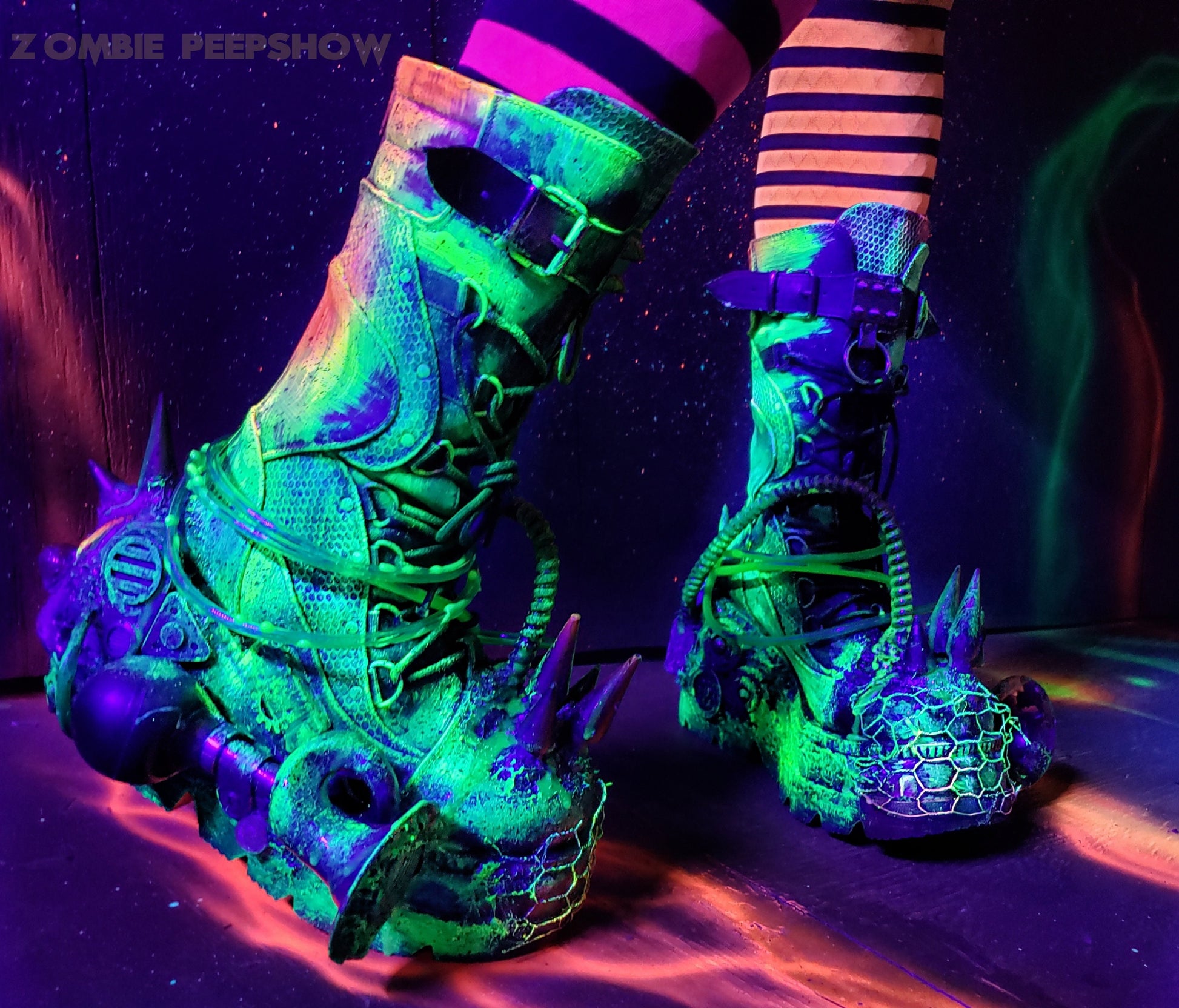 Clownocalypse boots feature an intricate hand sculpted design. Each boot showcases sculpted clown skulls with spiked mohawks. Details include grungy texture, assorted gears, pressure cages, UV glow hose, and horns. A sound box is concealed in one of the horns that plays old 40s style music. The boots are heavily distressed and layered in UV glow paint.