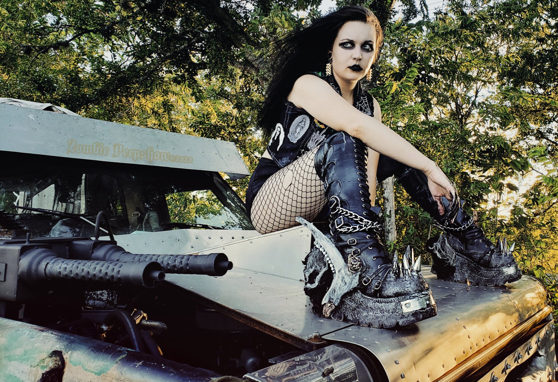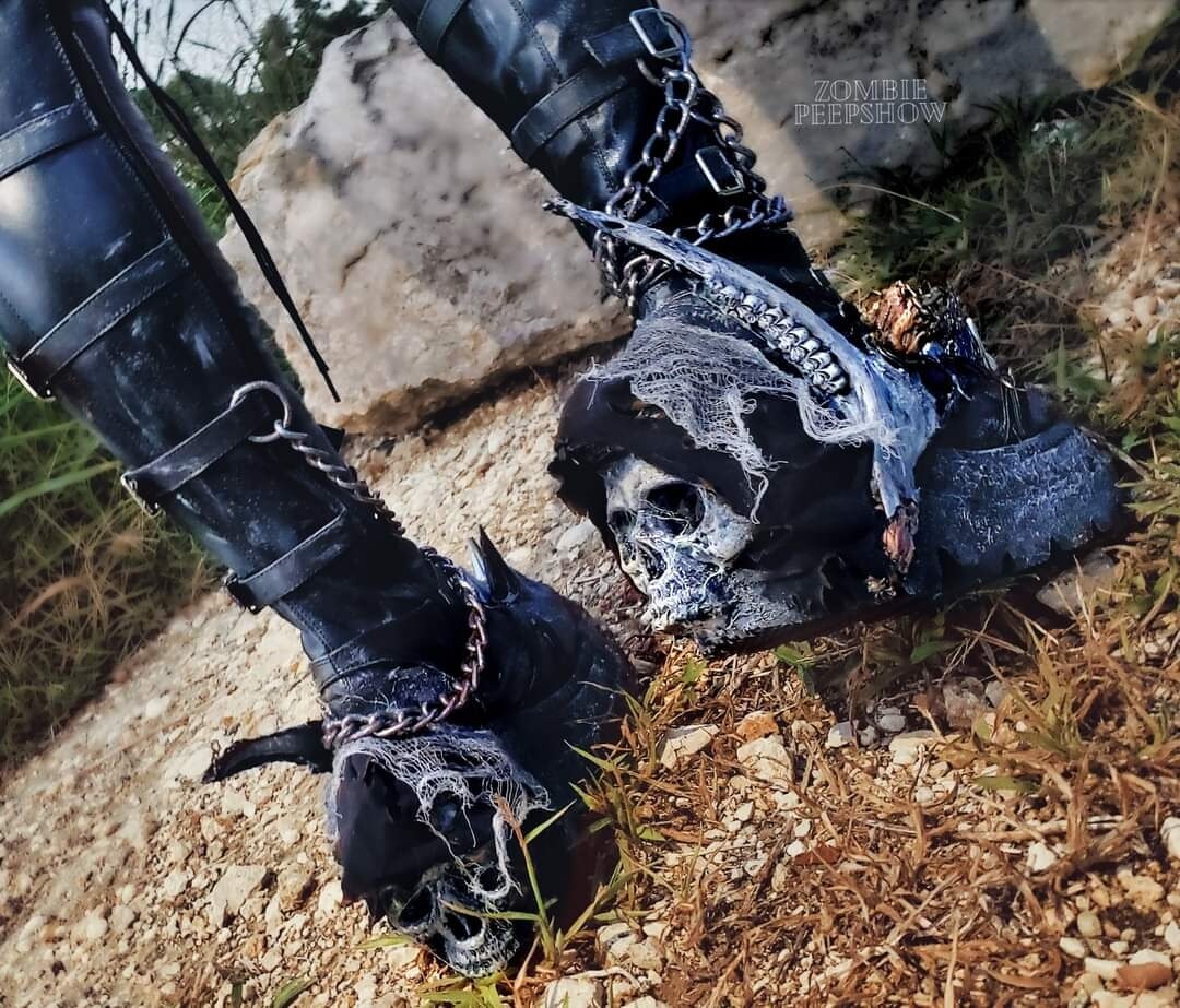 Death Valley boots feature sculpted Grim Reaper skulls with hoods. Details include grungy texture, assorted steel spikes, metal plates, buckles, and chains. A scythe casted from an ethically sourced jaw bone towers up the side. Optional UV black lights can be mounted on the skull and front shin of the boots.