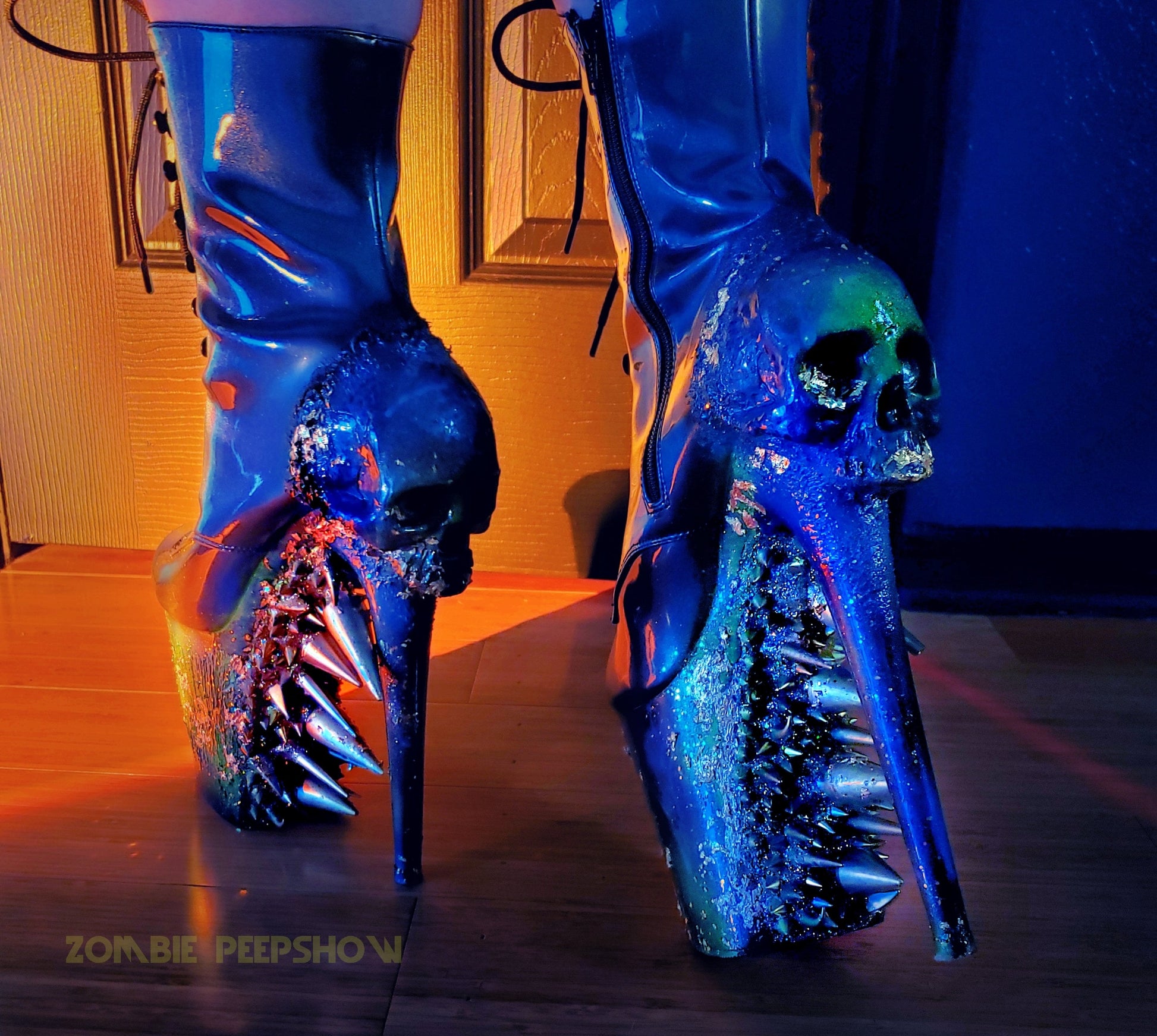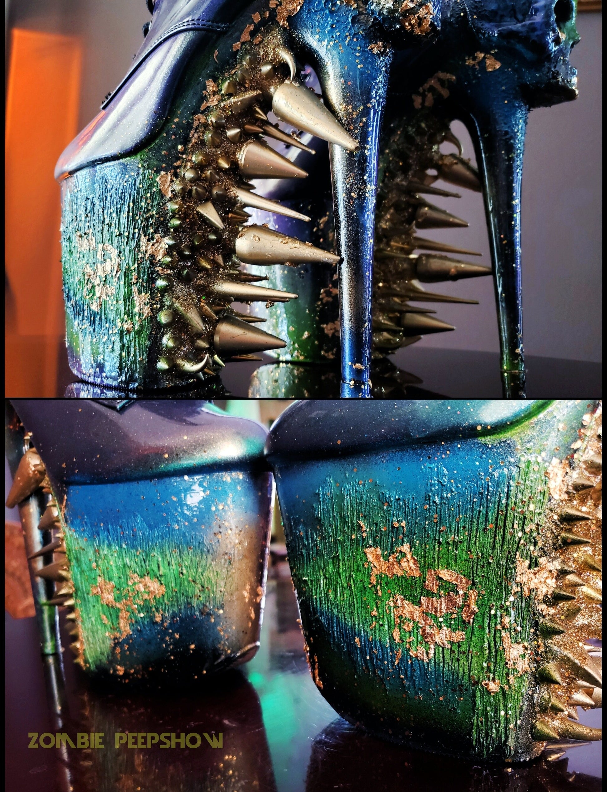 Space Grunge Boots feature sculpted skulls and textured platform. Each heel has assorted spikes, texture, and gold leaf detail.
