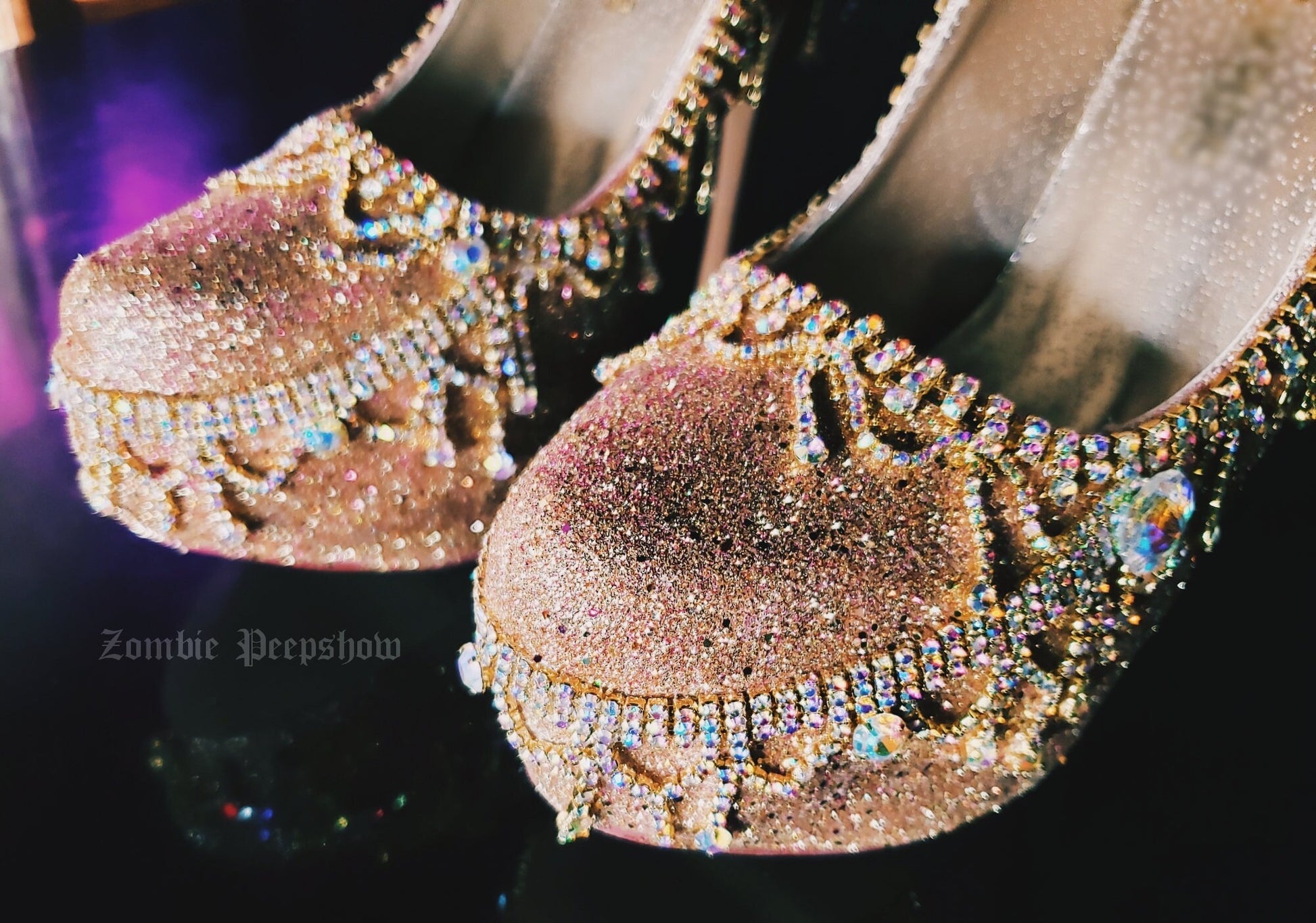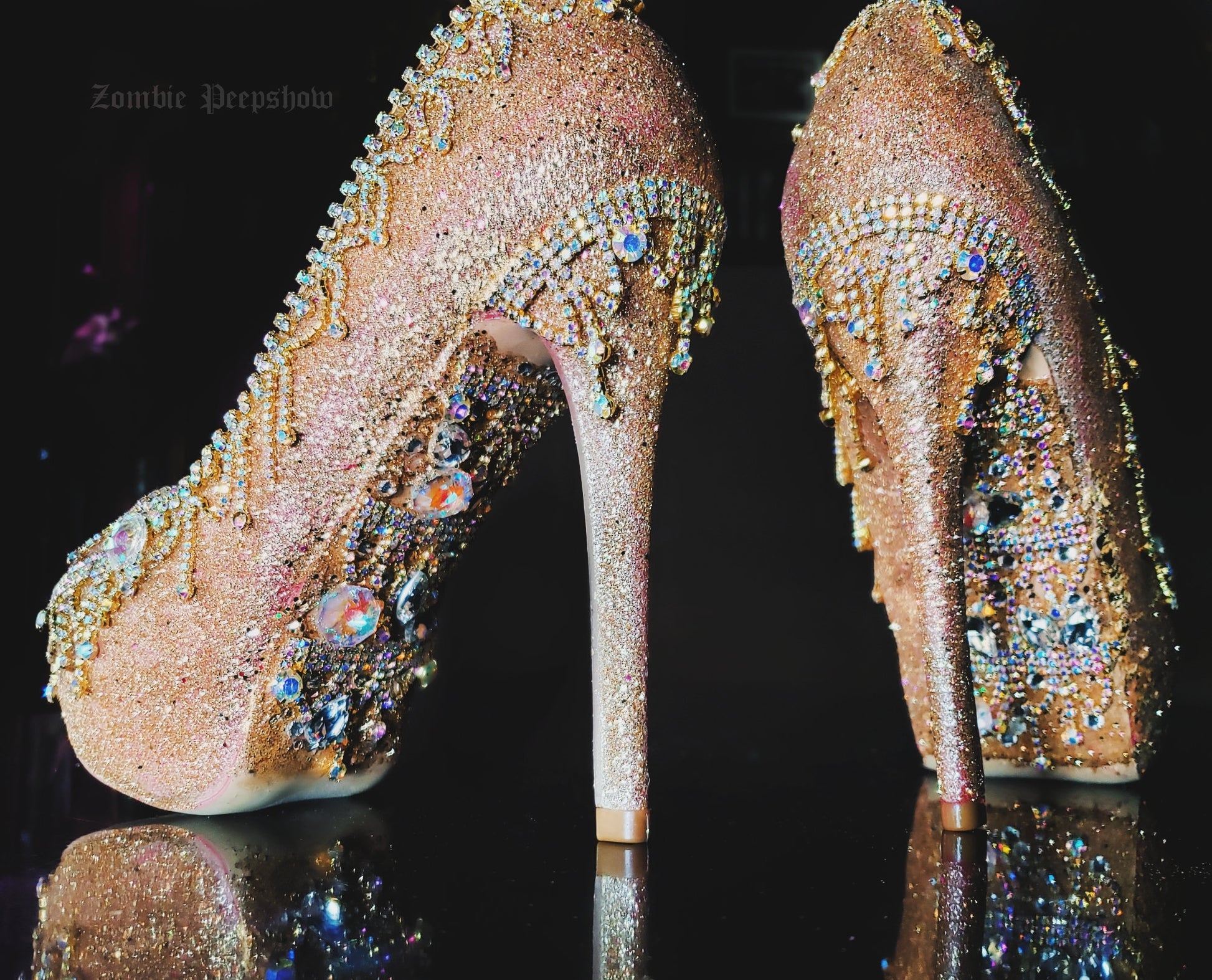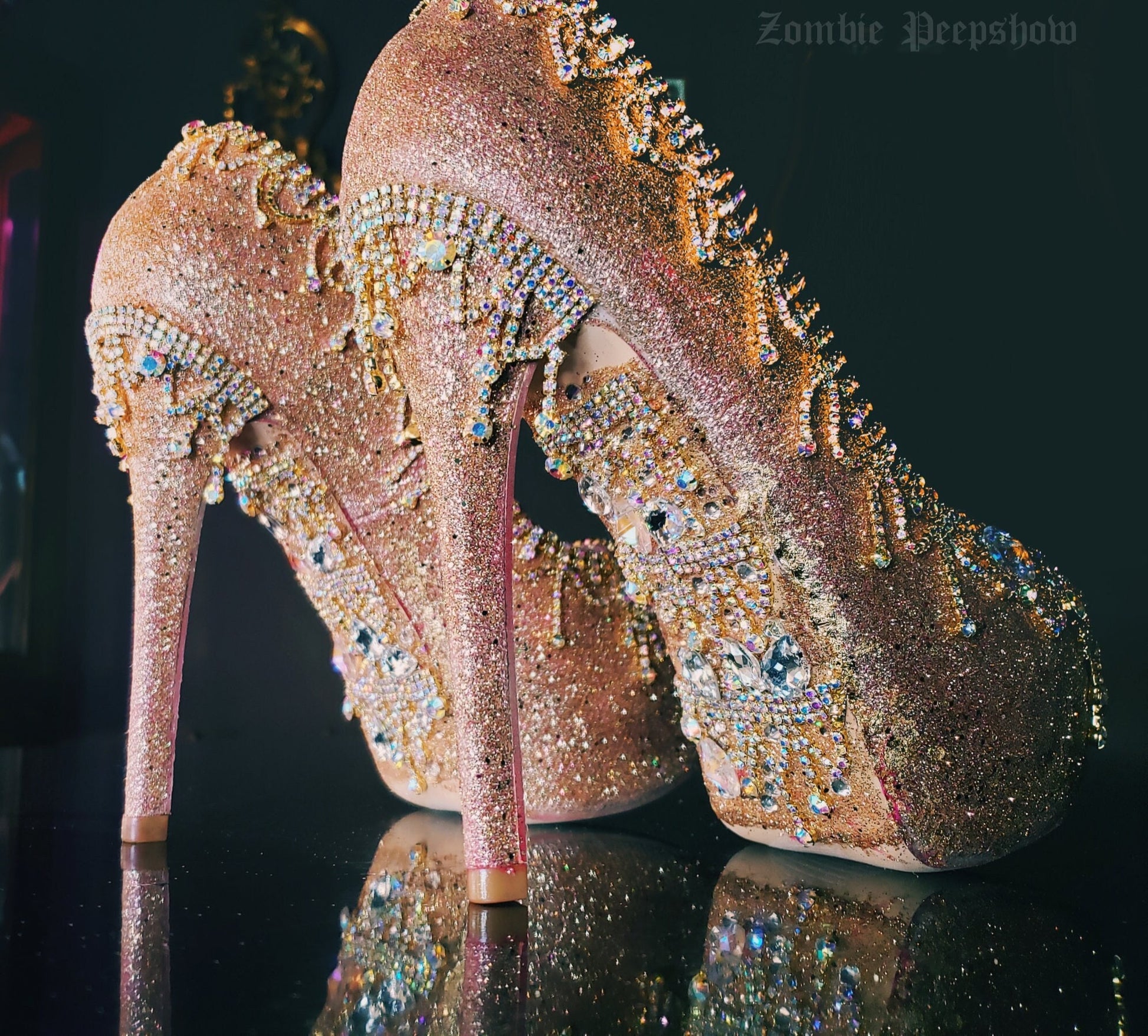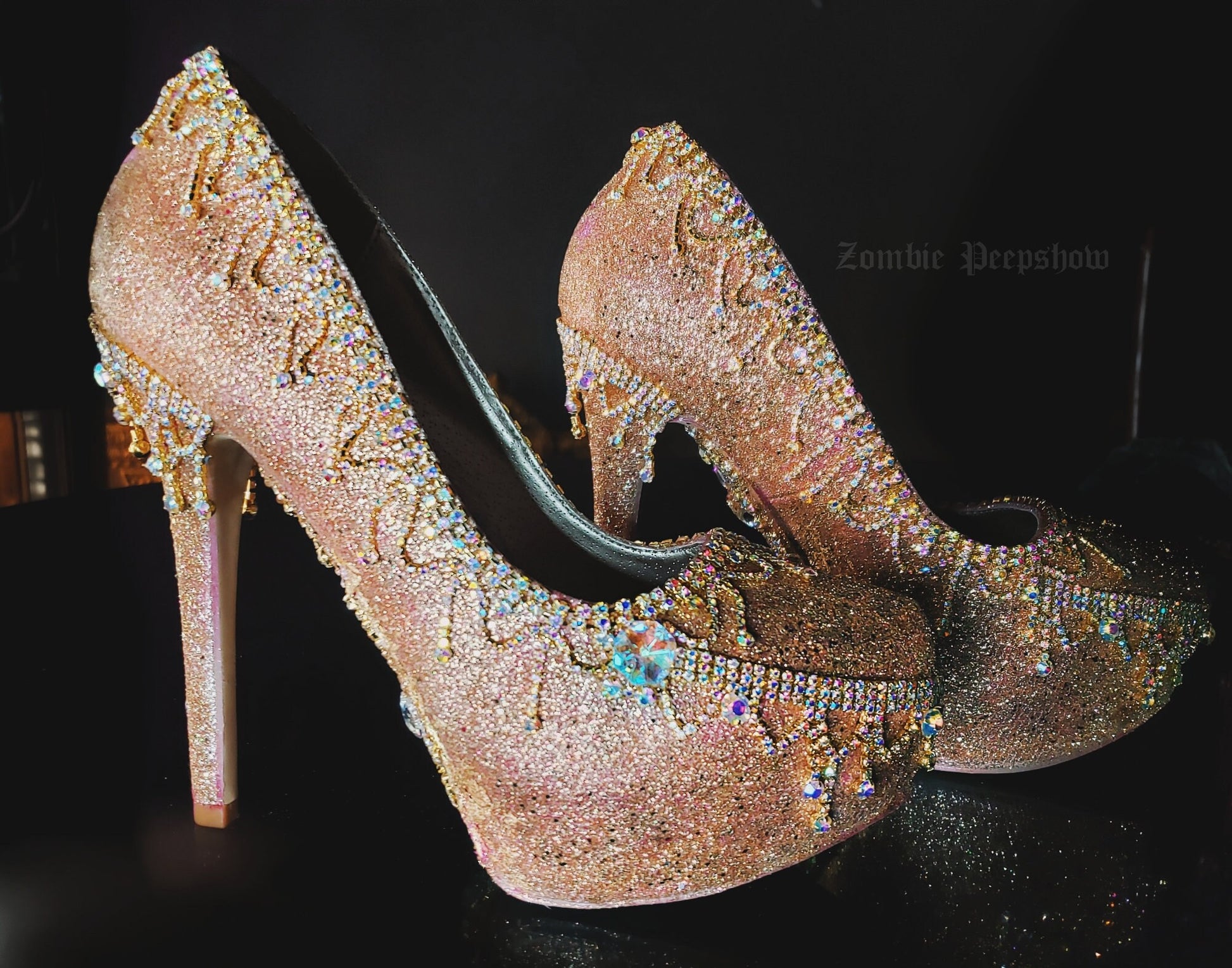 Duchess pumps are hand painted and coated in rose gold multi-glitter mix. Each shoe features assorted crystal and gold trim details. Optional lower heel heights available.