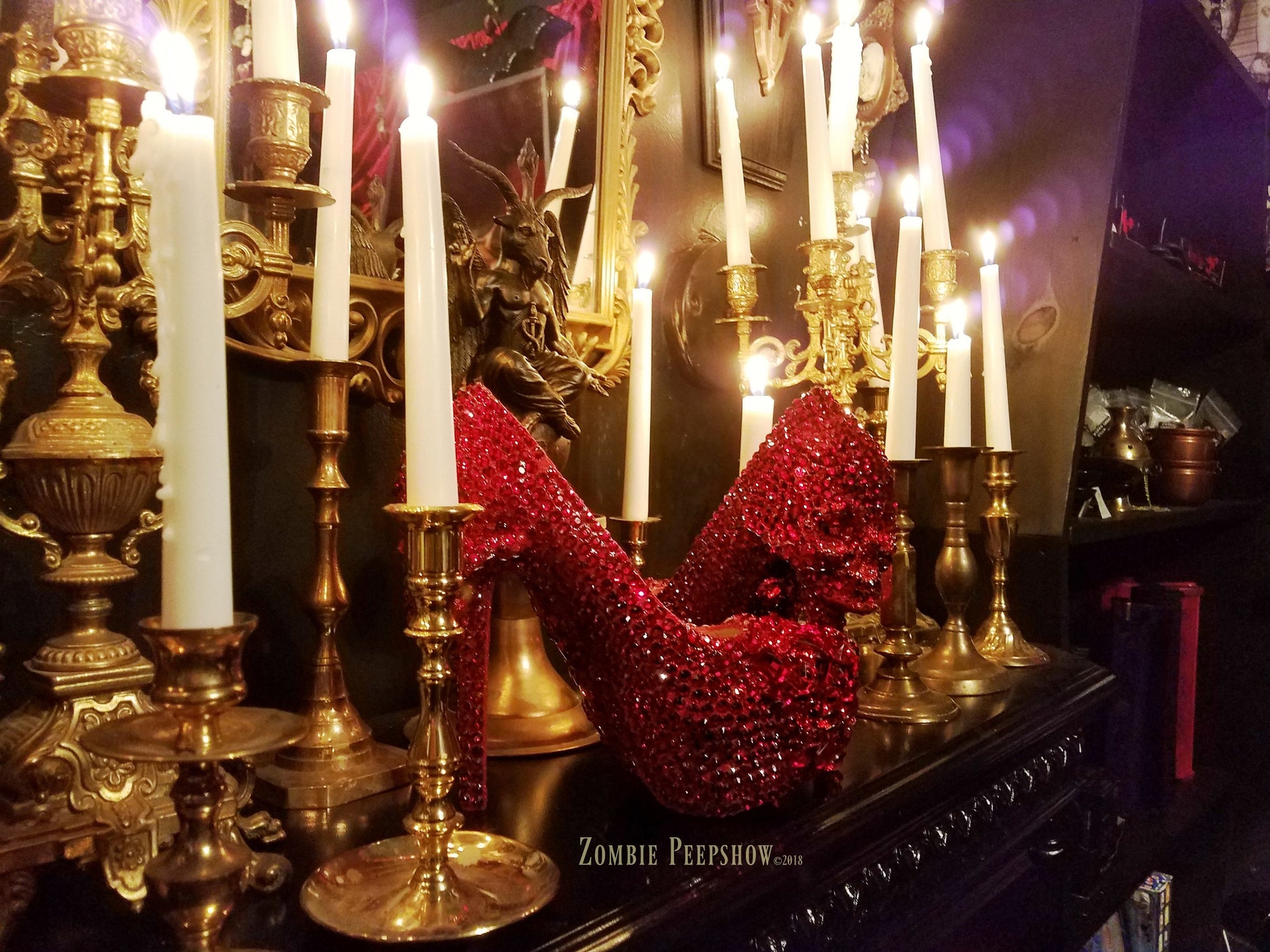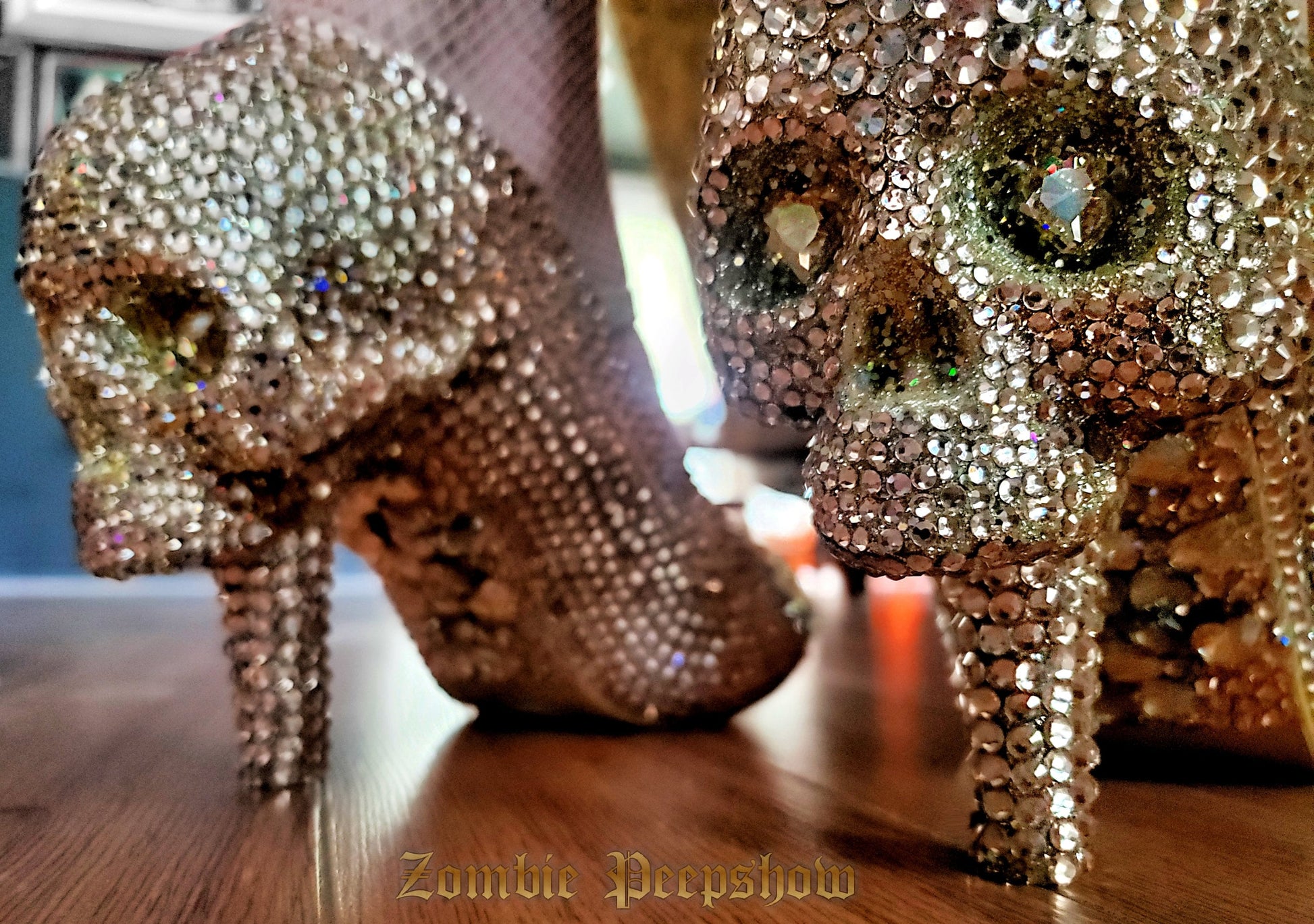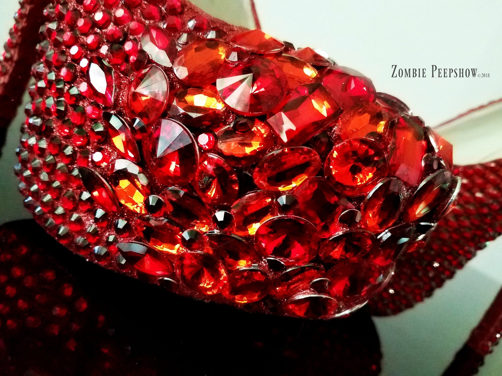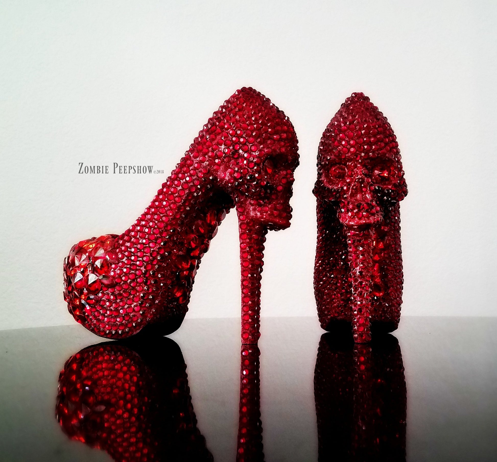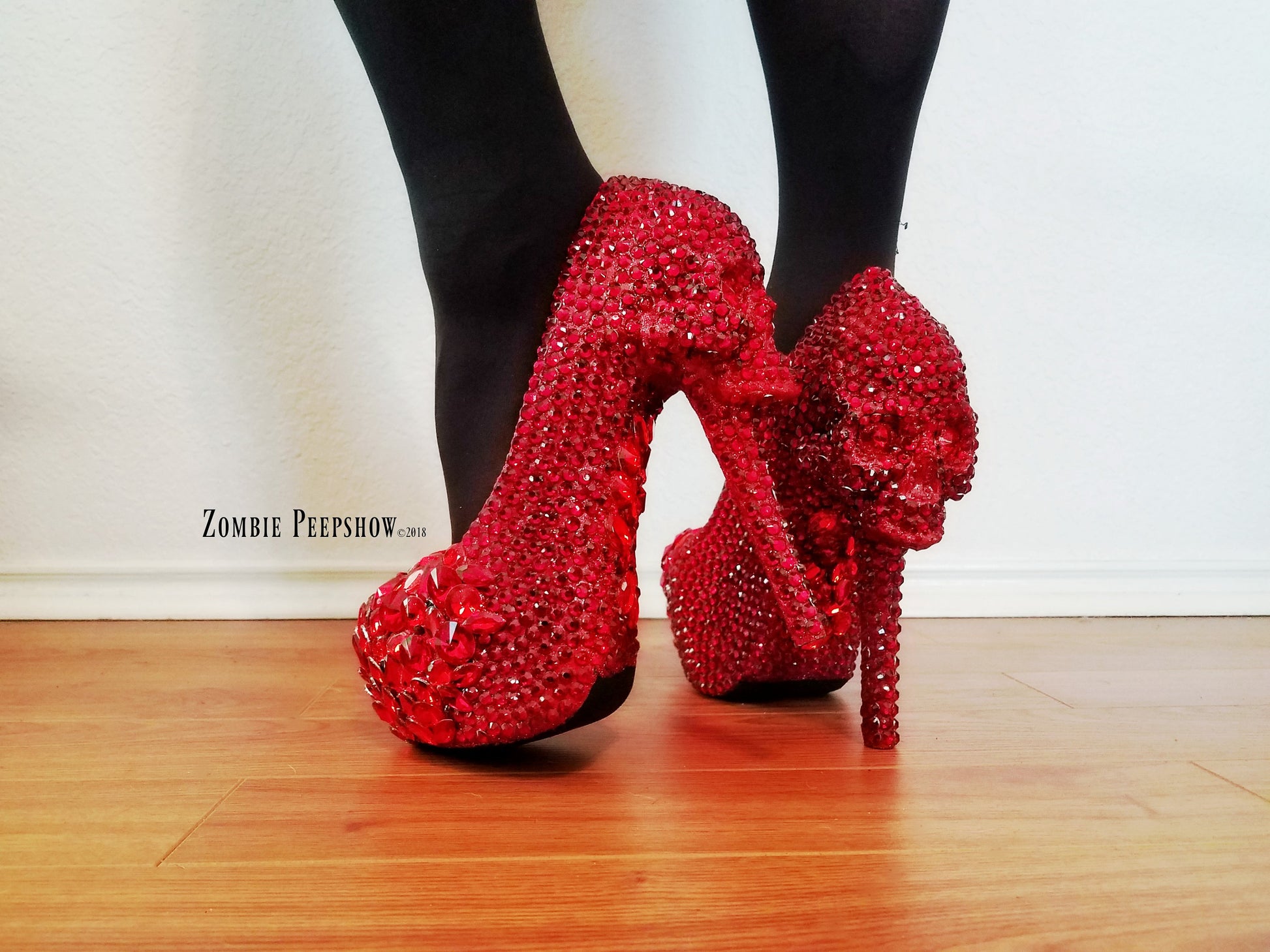Ruby Red Purgatory are hand painted and textured with skulls. Each shoe features thousands of hand placed crystals and stones. Finely milled glitter is mixed throughout the crystal detail.