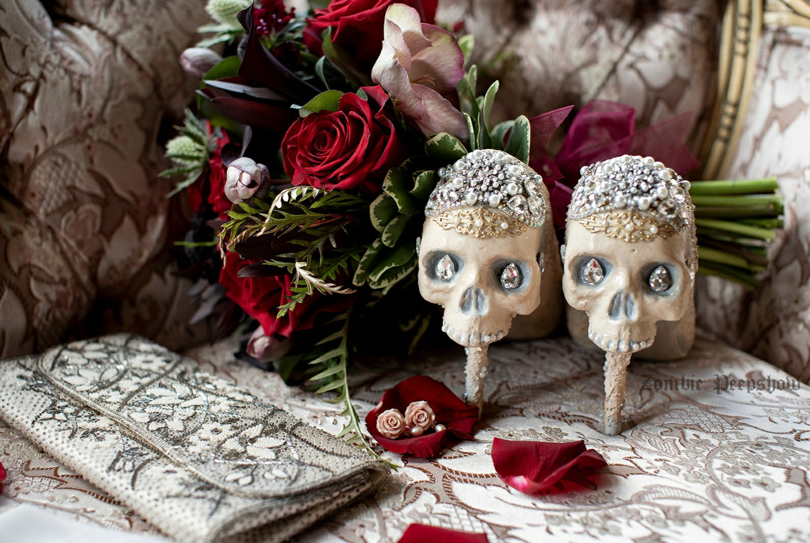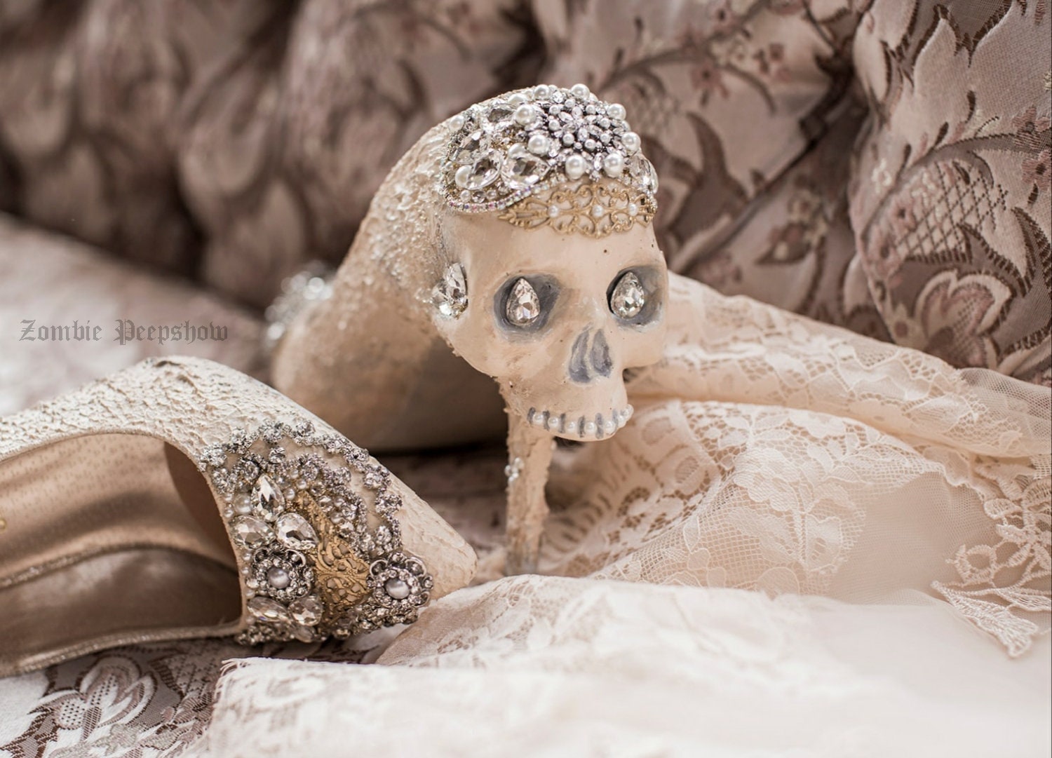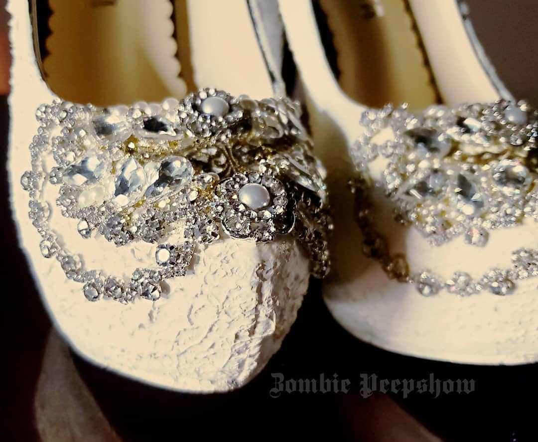 Holy Matrimony Pumps are hand painted and textured with skulls. They feature a variety of crystal detail and decoration. Each shoe has pearl adornments and metal filigree. The base color is a light ivory with soft aged bone accents.