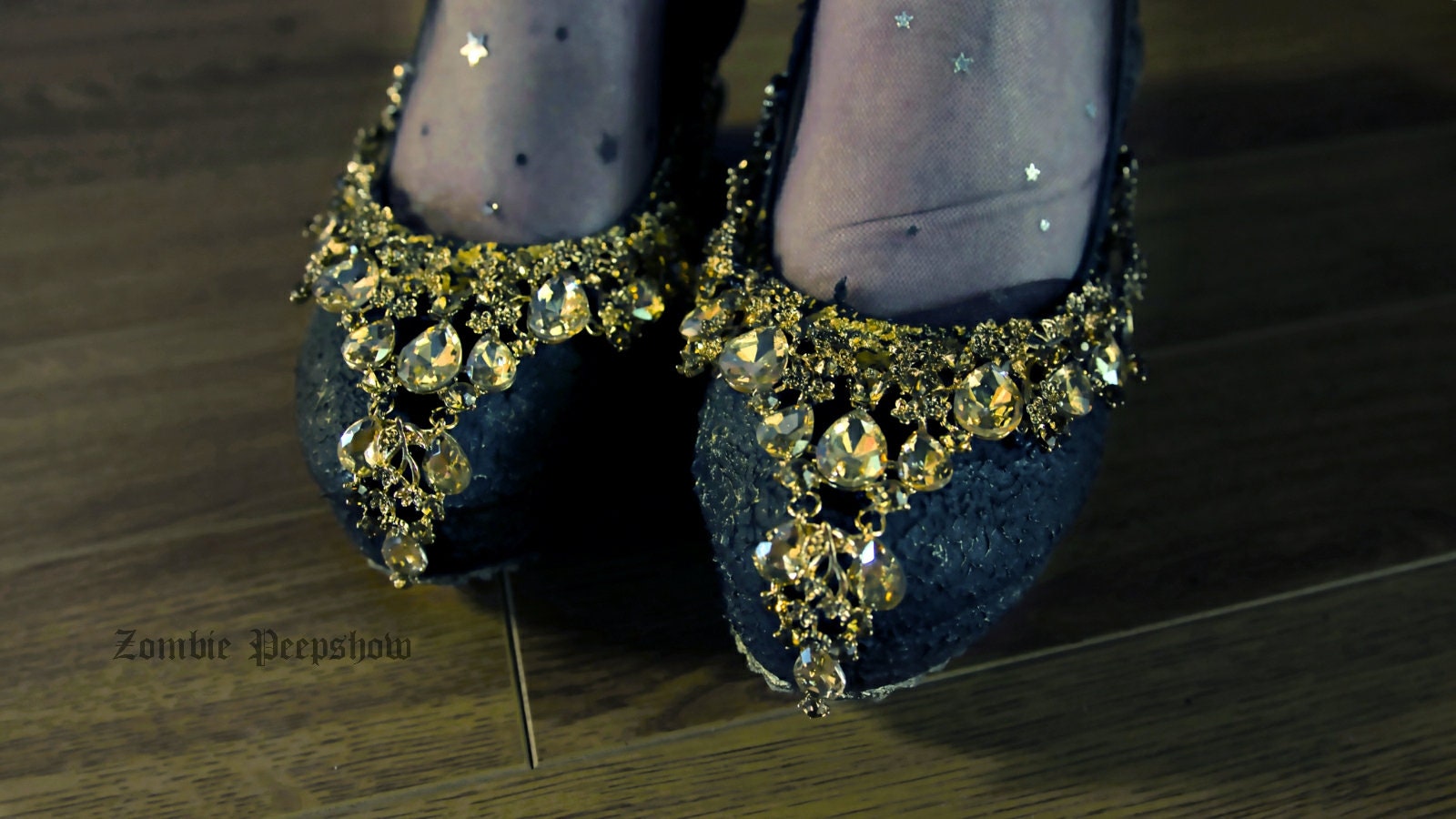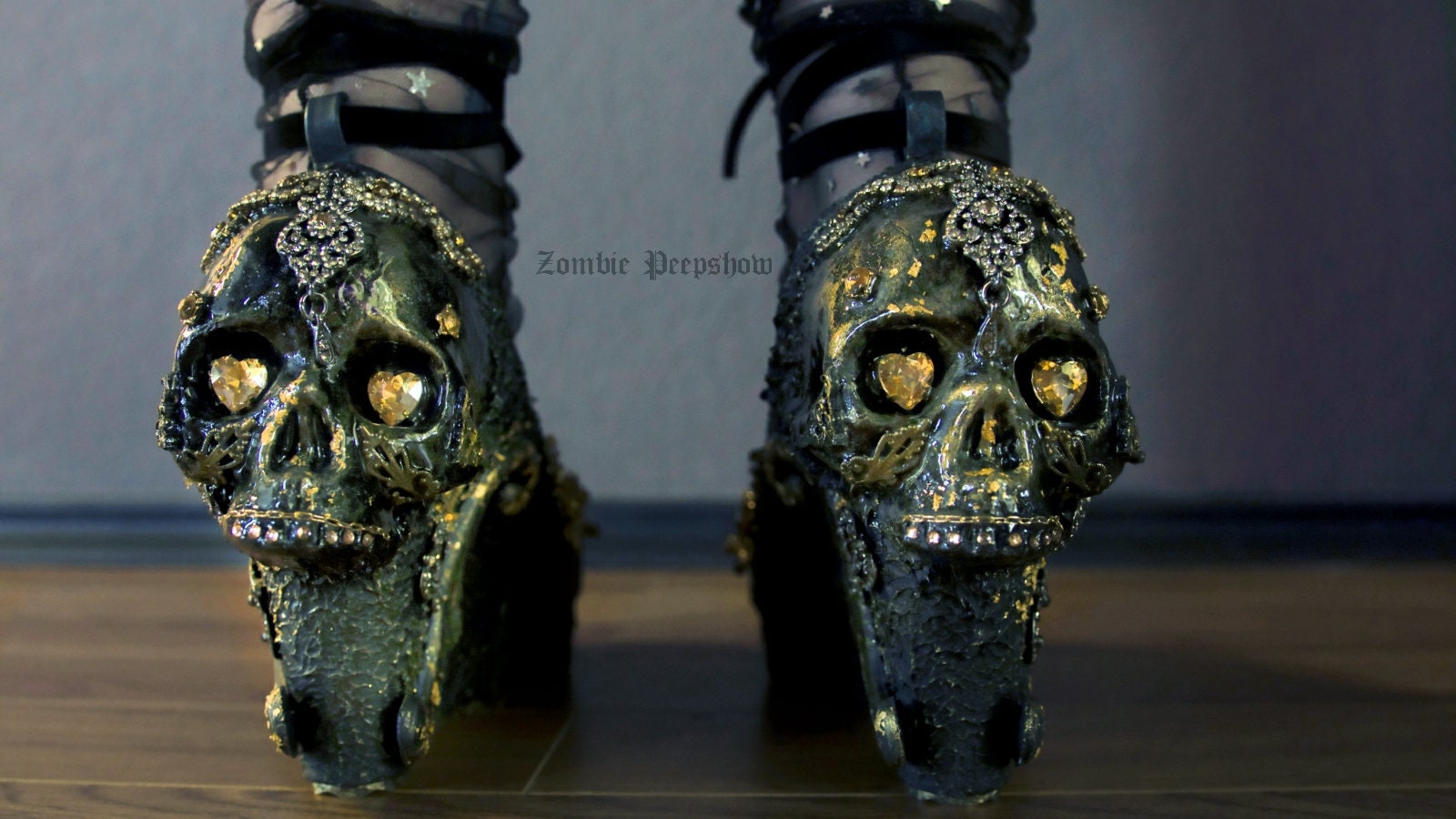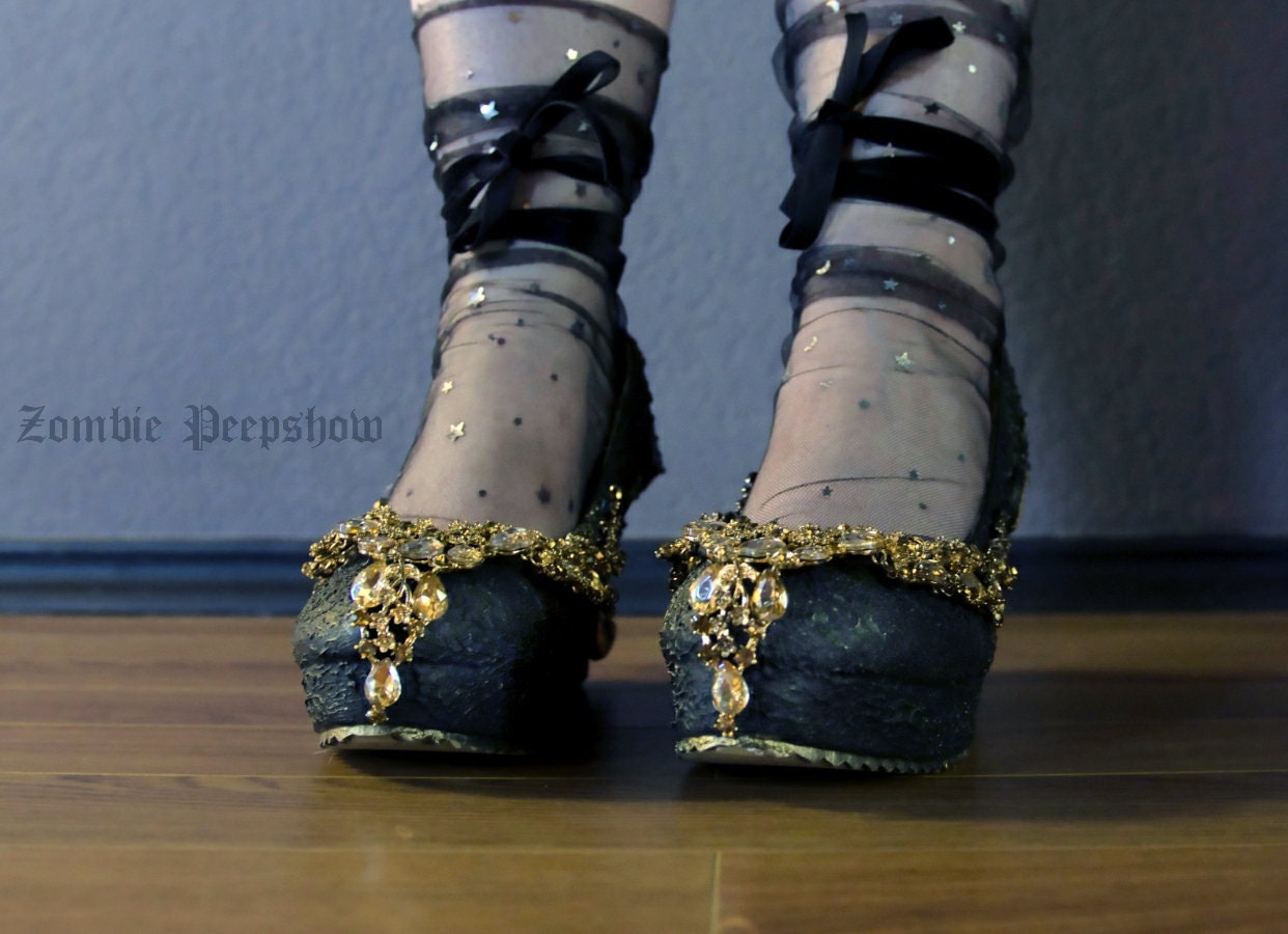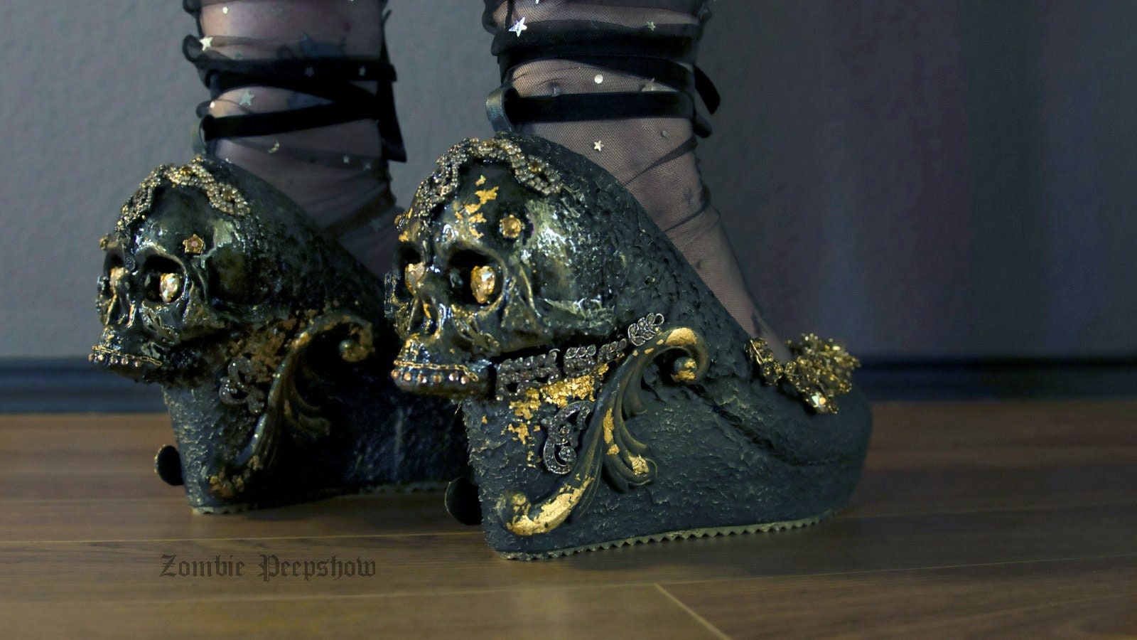 Unholy Matrimony Wedges are hand painted and textured with skulls. They feature a variety of crystal detail and decoration. Each shoe has filigree adornments and velvet ribbon that ties around ankle. The base color is black with gold paint accents and gold leaf.