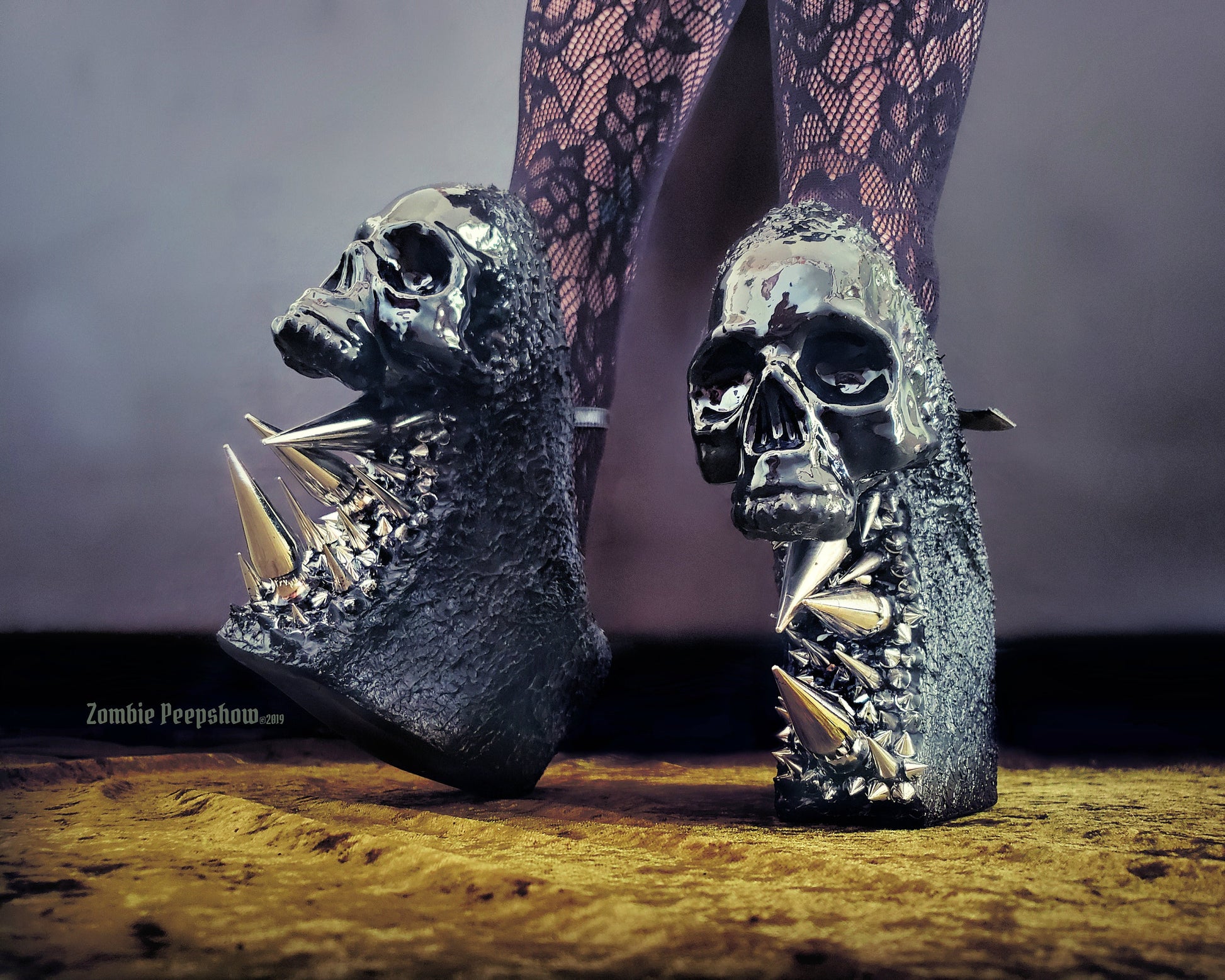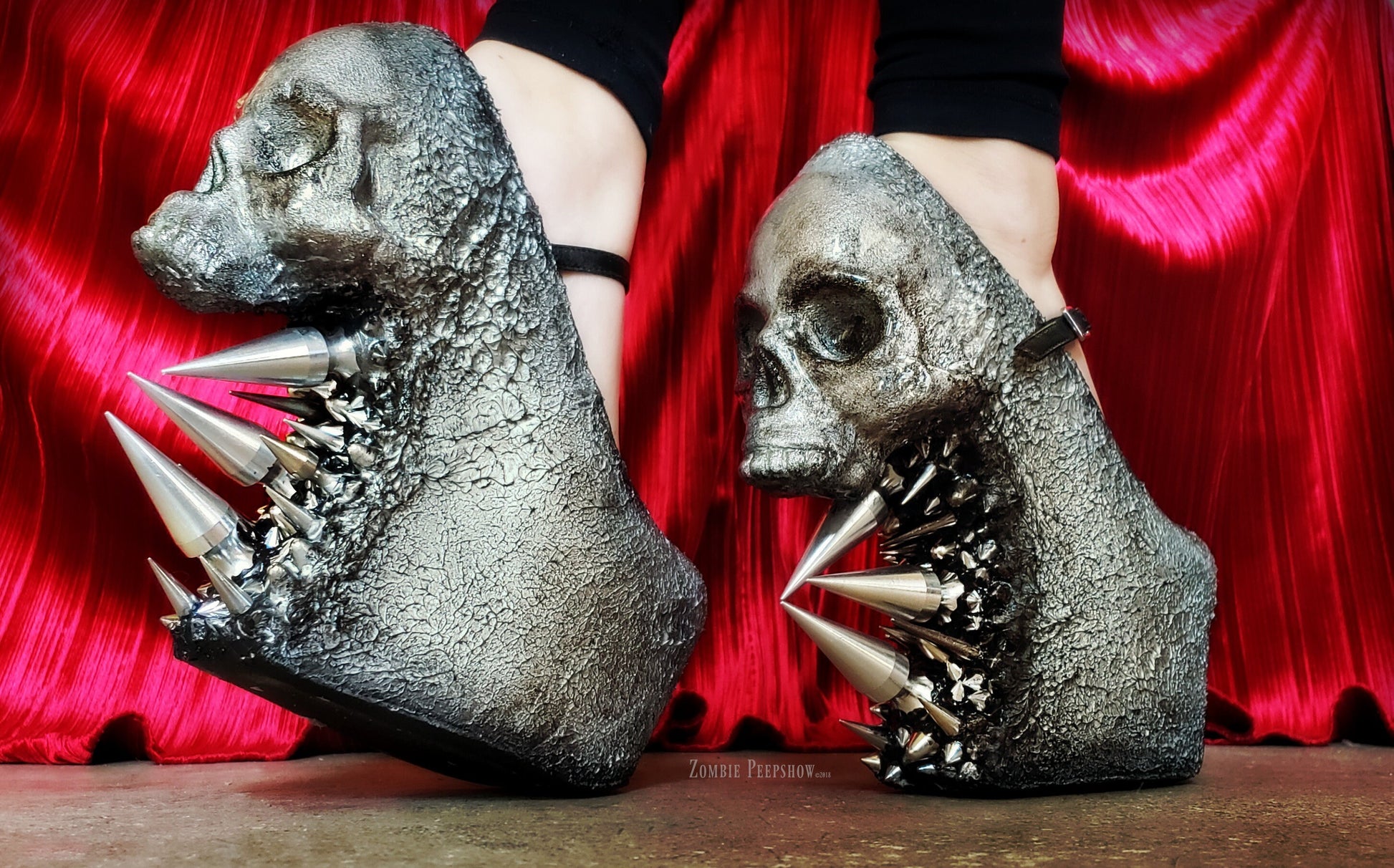 Purgatory Spiked Wedges are hand painted and textured with large skulls. Steel spikes cover the back heelless area.