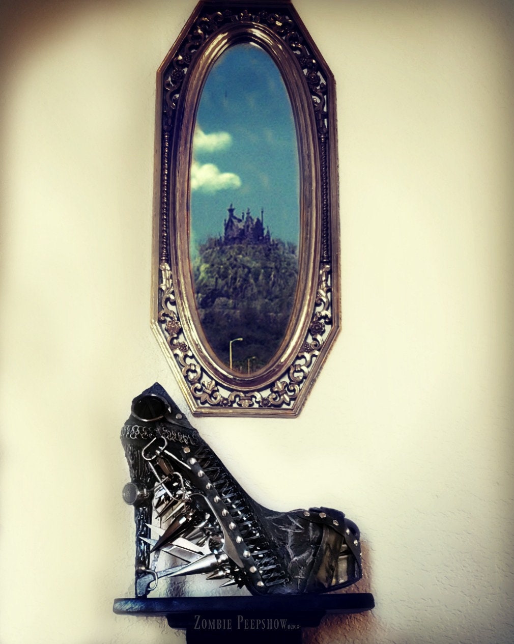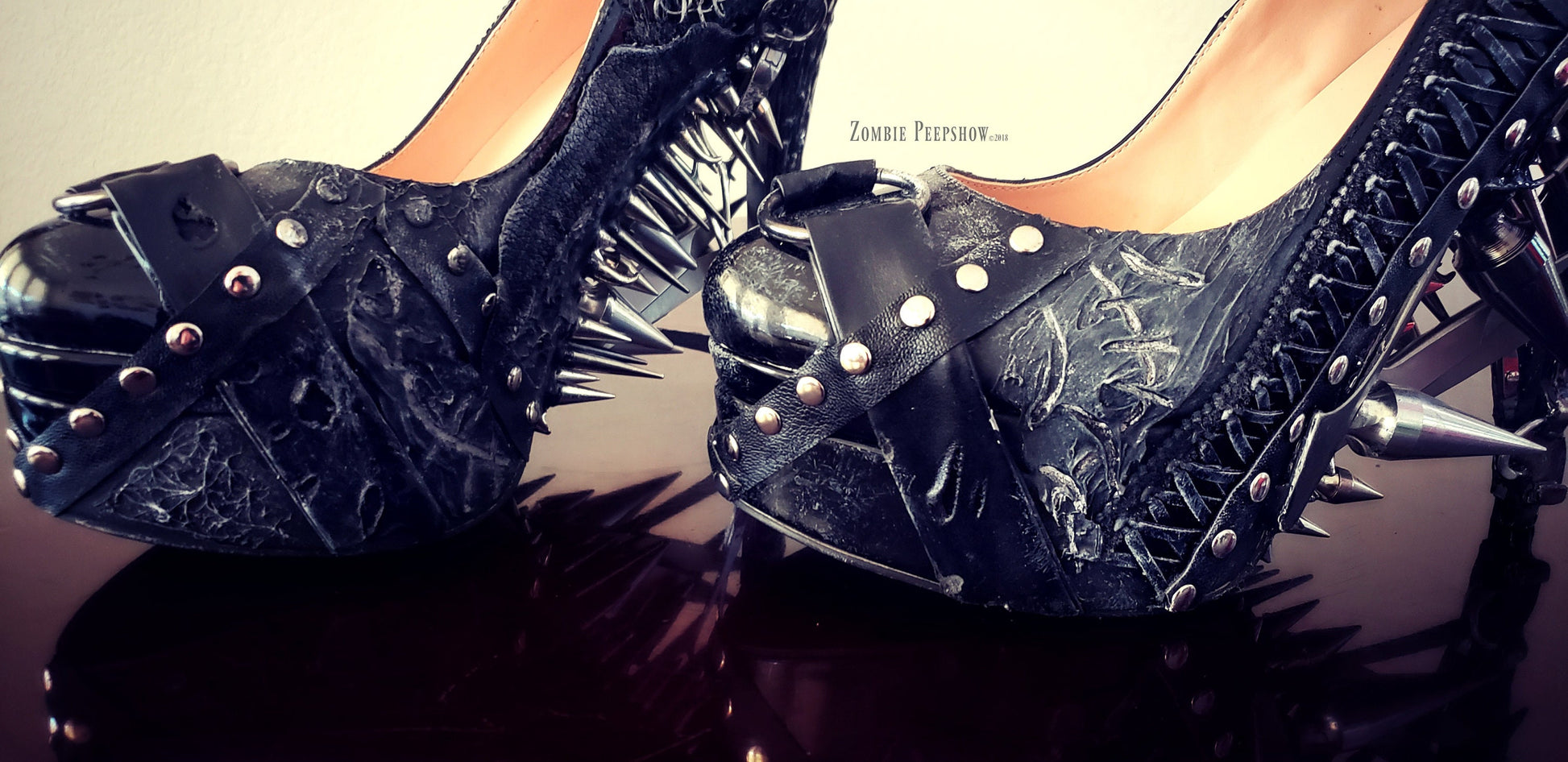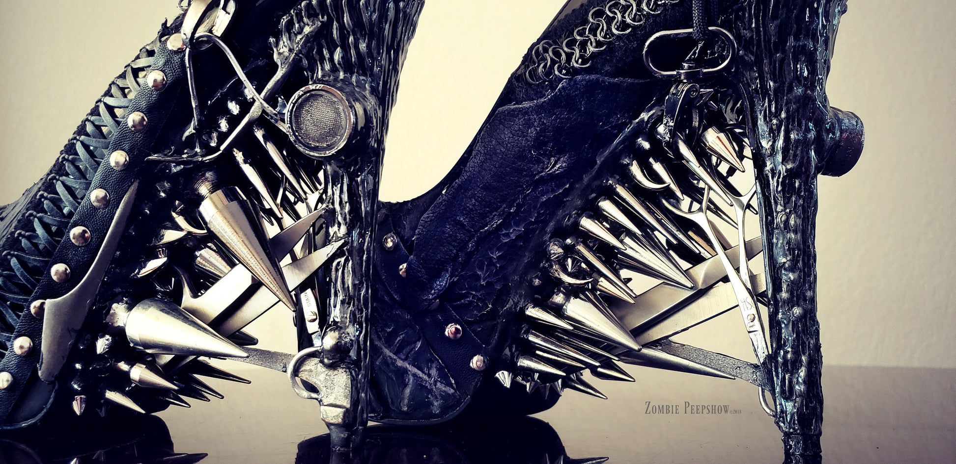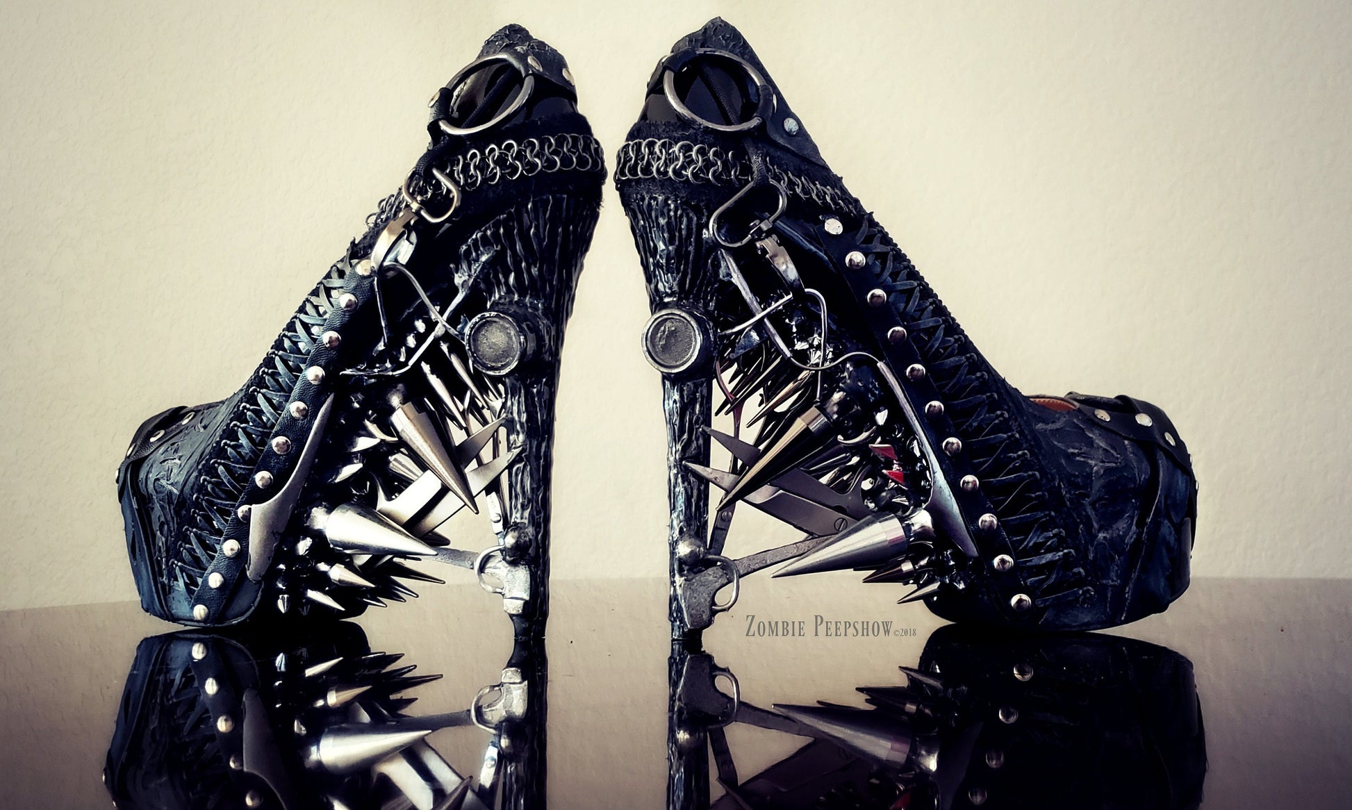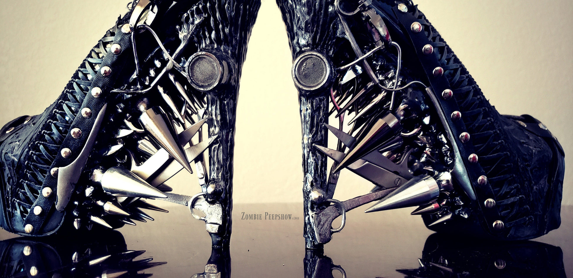 These Edward pumps feature a distressed faux leather base. Each shoe has multiple scissor blades, large steel and assorted spikes, distressed fabric, and other metal detail.