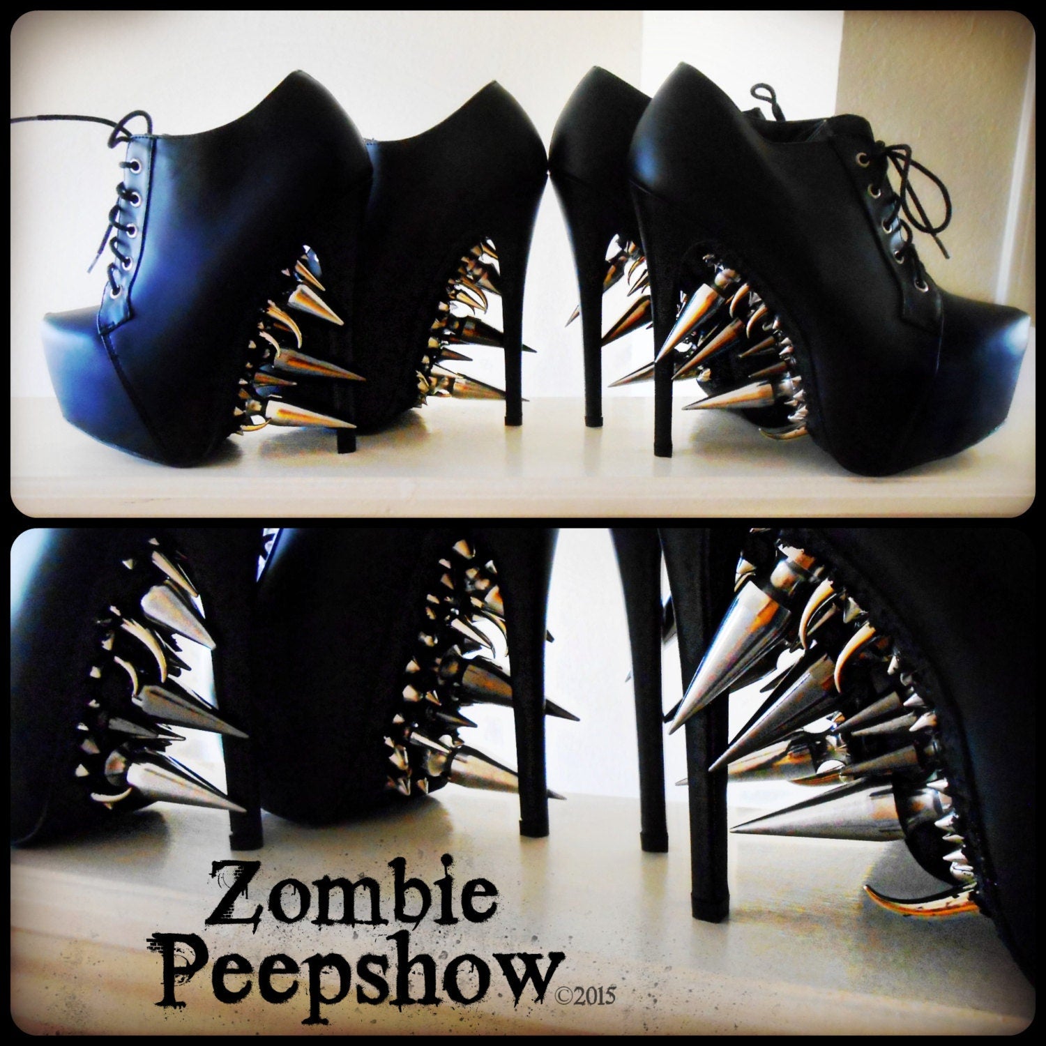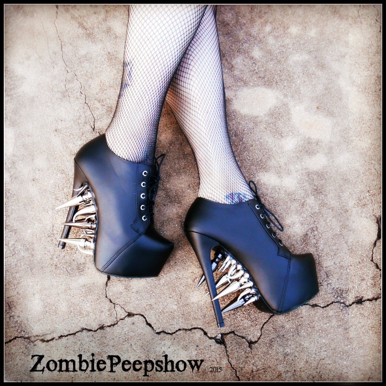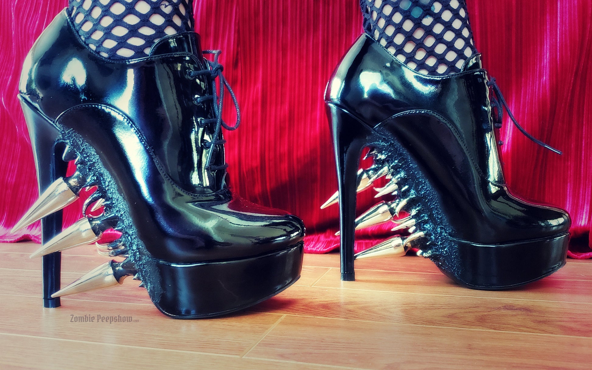 Riot Boots feature assorted steel and claw spikes. Boots may be shiny vinyl or matte faux leather depending on size availability.