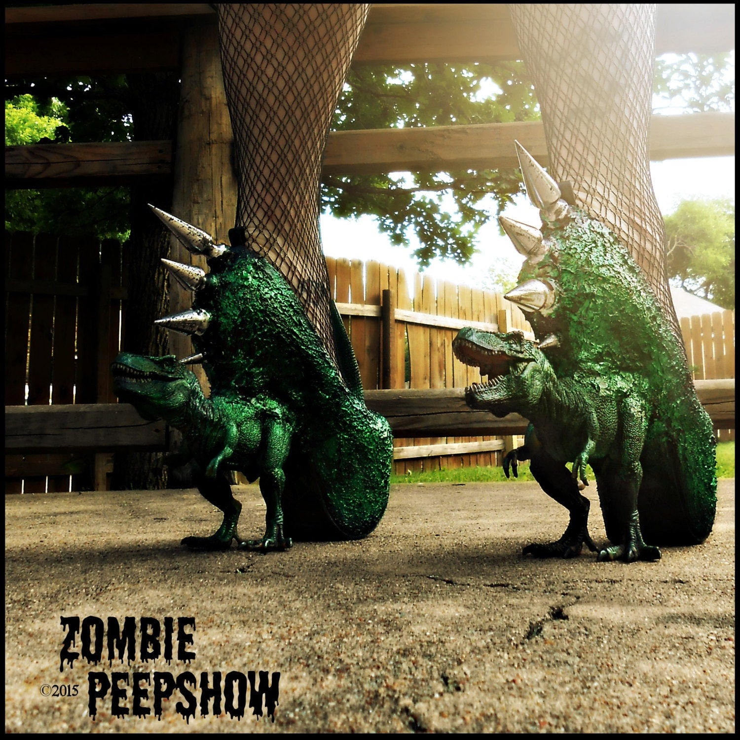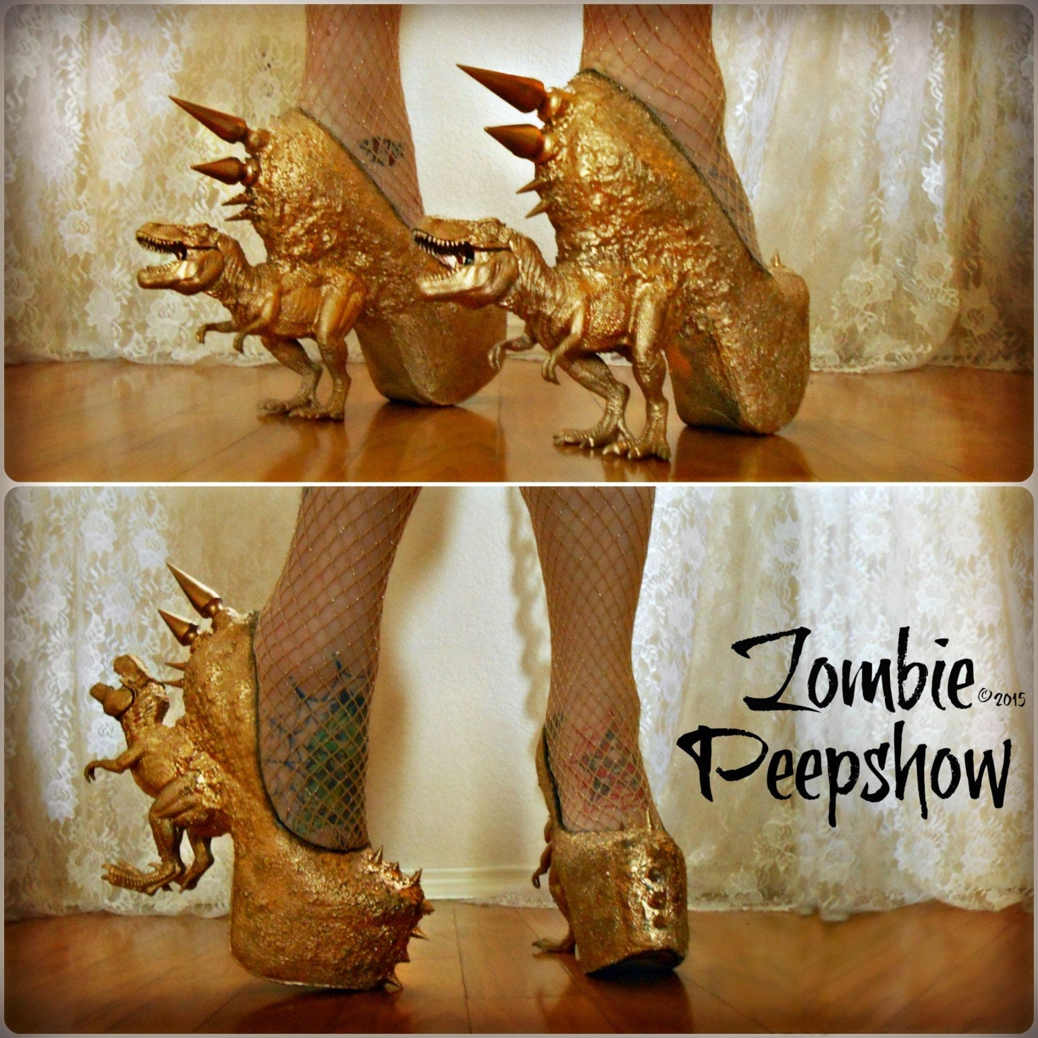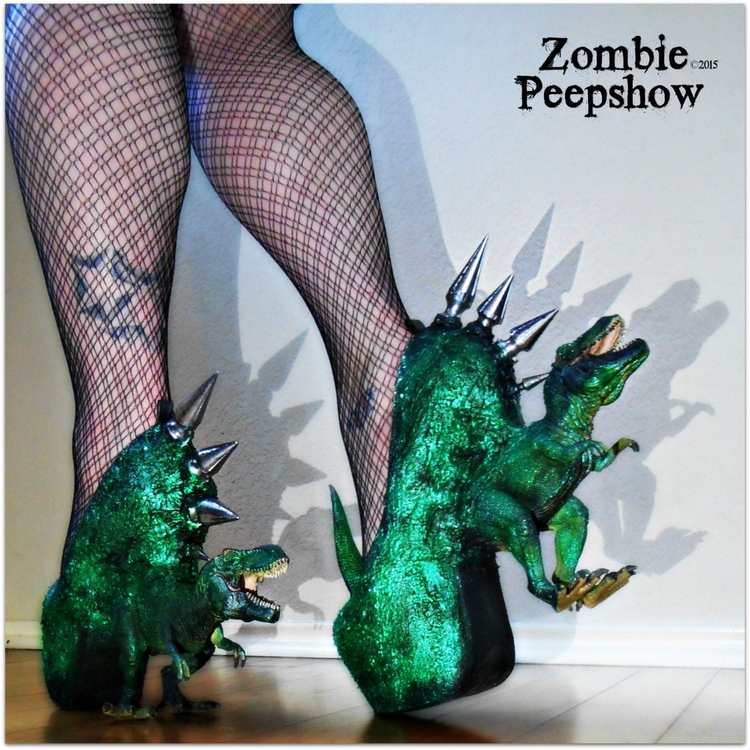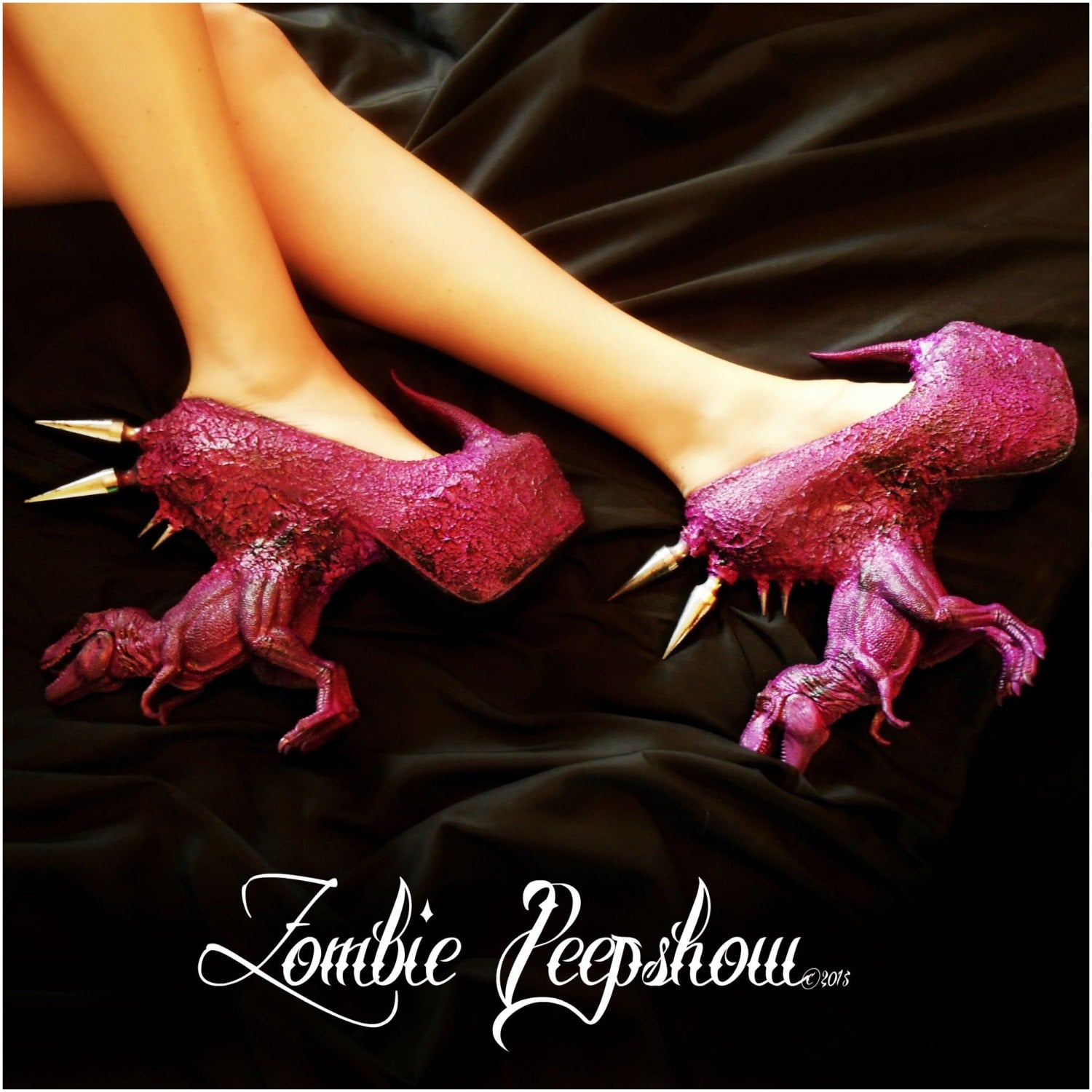 Jurassic Pumps are hand painted and textured. Each shoe features mounted T-Rex statues, steel spikes, and metallic paint.