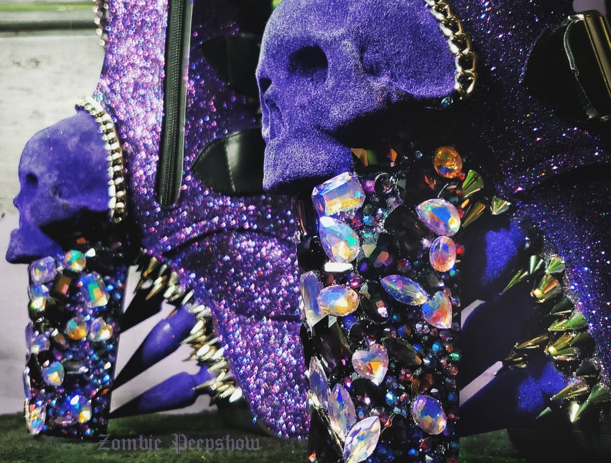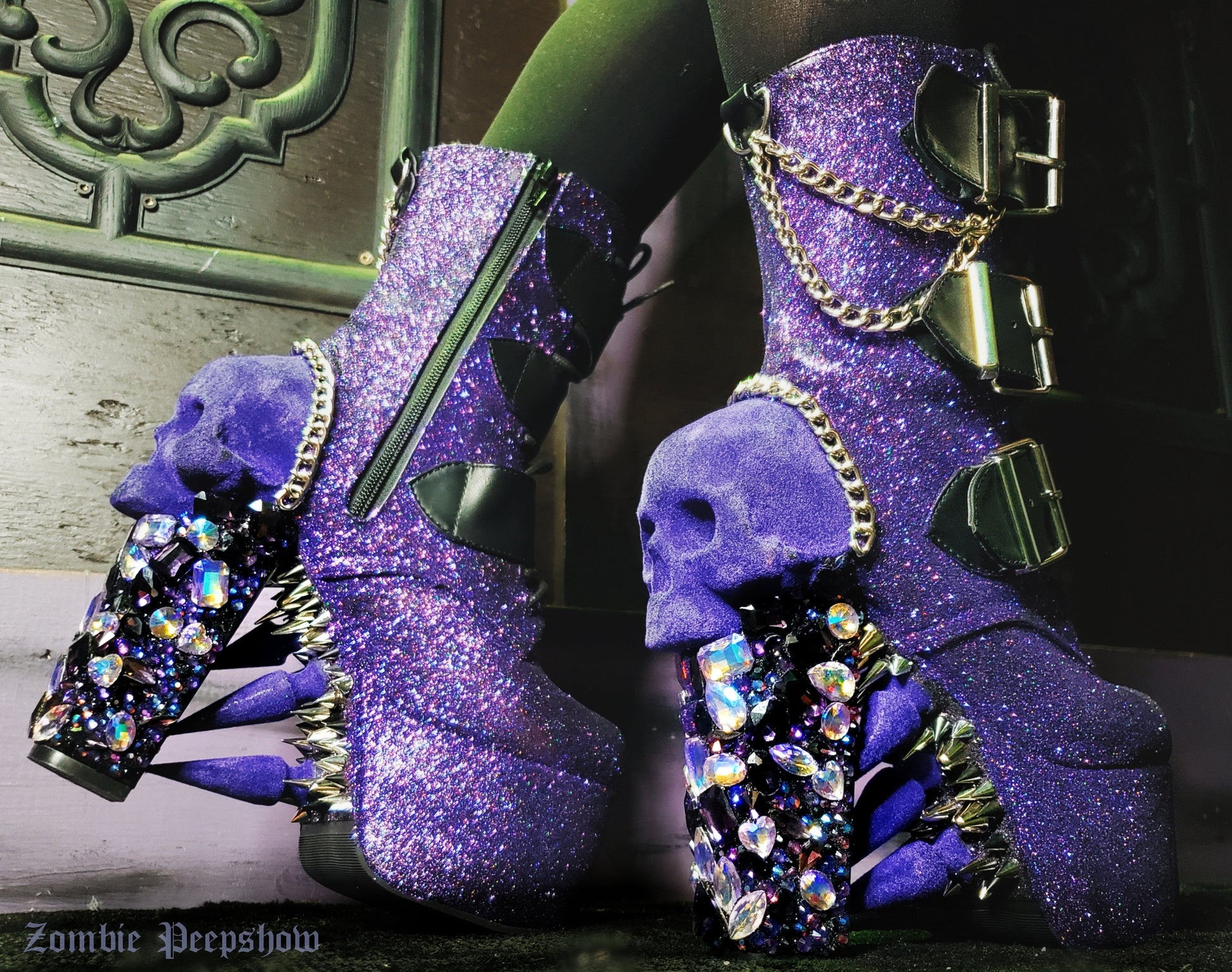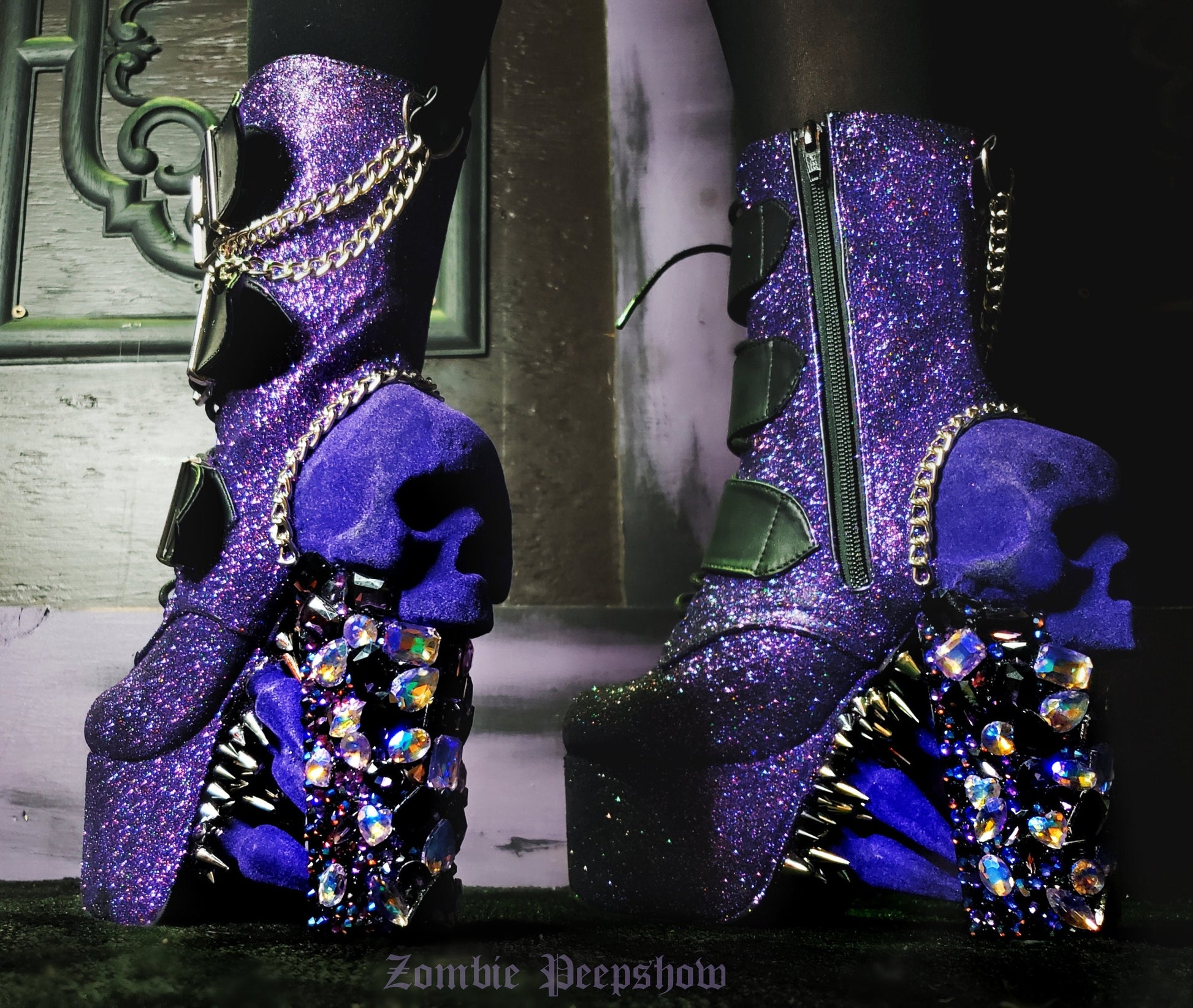 Adored platform boots are coated in a multi glitter mix, sealed for longevity. They feature velvet skulls, velvet and metal spikes, assorted crystal and chains.