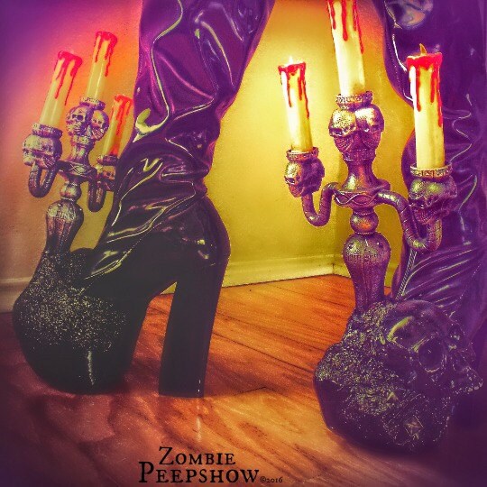 Transylvania Boots feature a patent vinyl finish, pyramid studs, and skulls. Each is adorned with a large skull candelabra. The candelabras have flickering LEDs mounted at the tip of each candle.