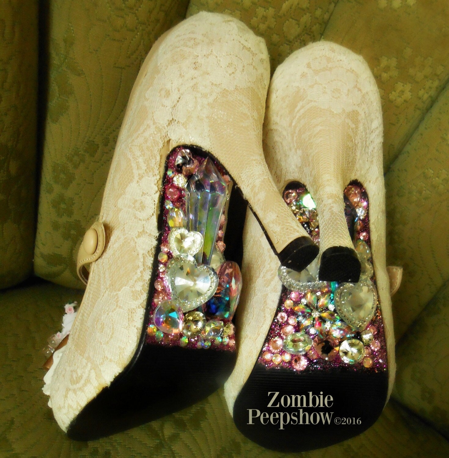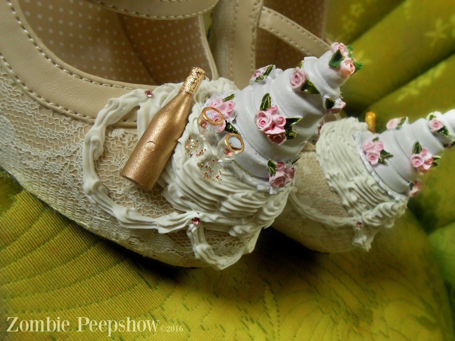 Reception pumps are adorned with an ivory lace base and frosting detail. Each toe features tiered wedding cakes, and miniature champagne bottles. The back soles are embellished with assorted AB crystal.